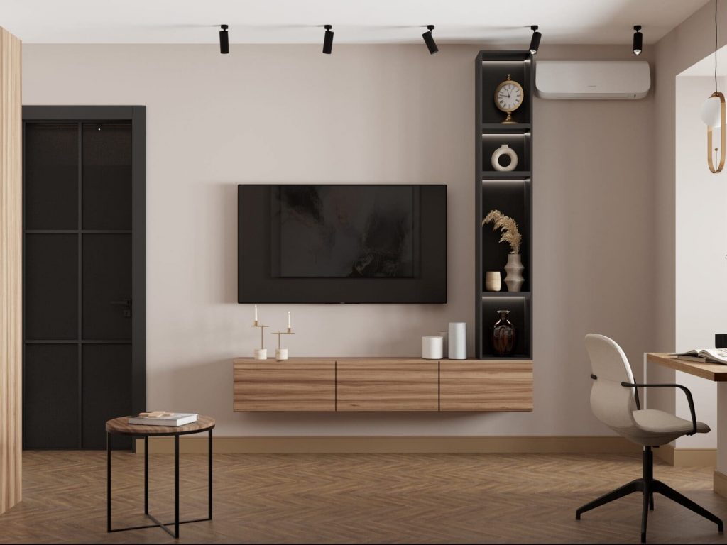 Телевизионная зона оформлена минималистично: подвесная тумба из светлого дерева и вертикальный стеллаж с нишами и подсветкой. Всё лаконично, но продумано до деталей — вплоть до расстановки декоративных акцентов.