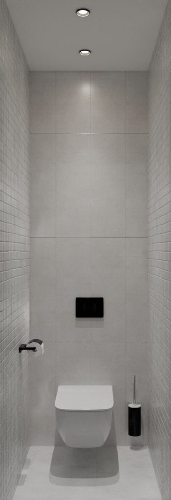 Туалет оформлен в том же ключе: серо-белая плитка с текстурой и акценты в чёрном (кнопка инсталляции, аксессуары), создающие визуальную завершённость.