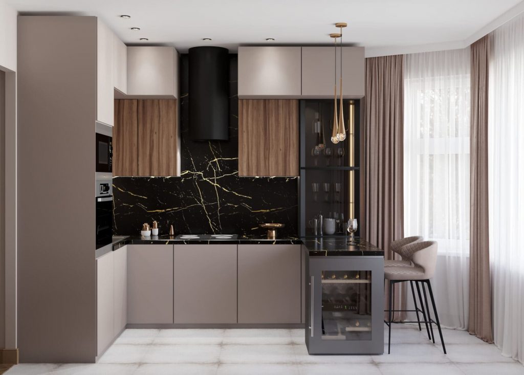 Вся композиция построена на игре контрастов: глубокий чёрный камень с золотыми прожилками в зоне фартука и столешницы эффектно выделяется на фоне матовых фасадов и теплых деревянных вставок.