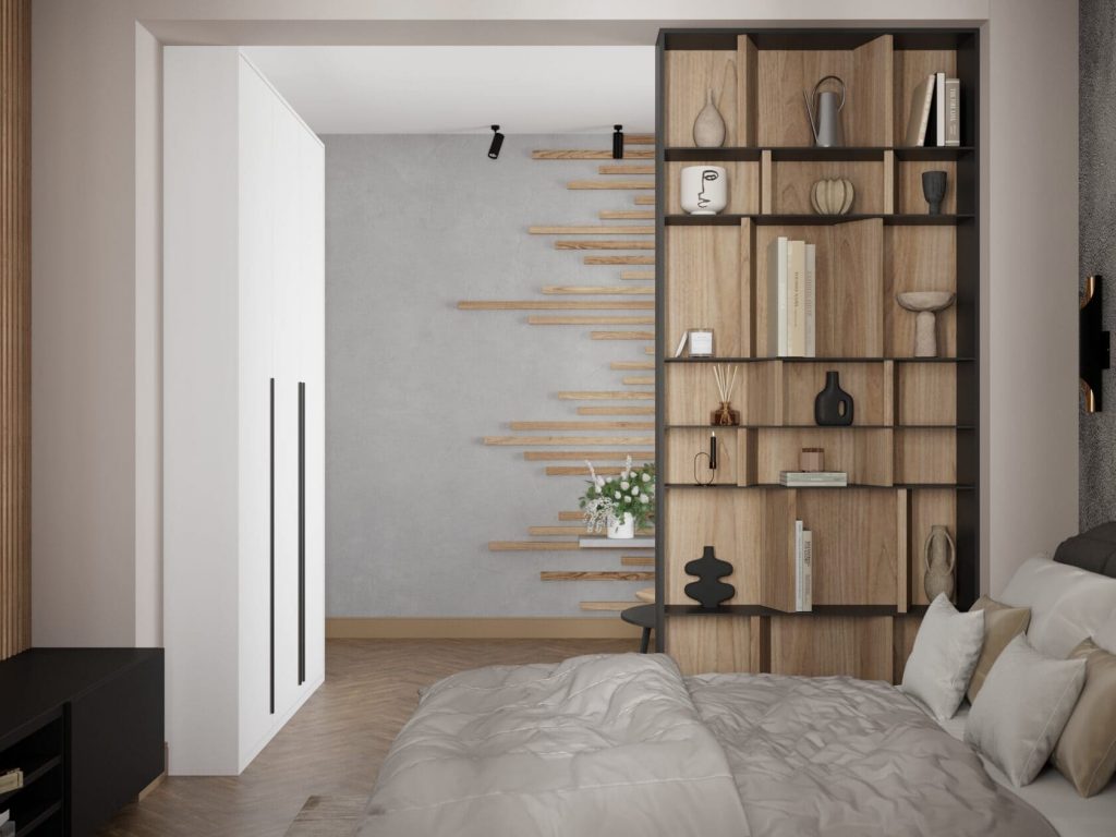 По другую сторону кровати — вместительный стеллаж, который деликатно зонирует спальню, не перекрывая свет. Он открывает обзор на прихожую и несёт как декоративную, так и практическую функцию.