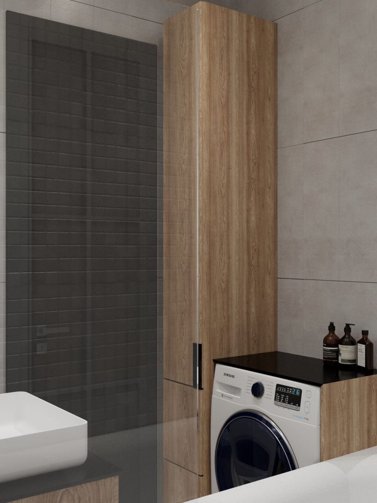 Главный акцент здесь — на сочетание текстур: тёплое дерево в мебели и нише для стиральной машины сочетается с графичными черными деталями и благородной фактурой плитки.