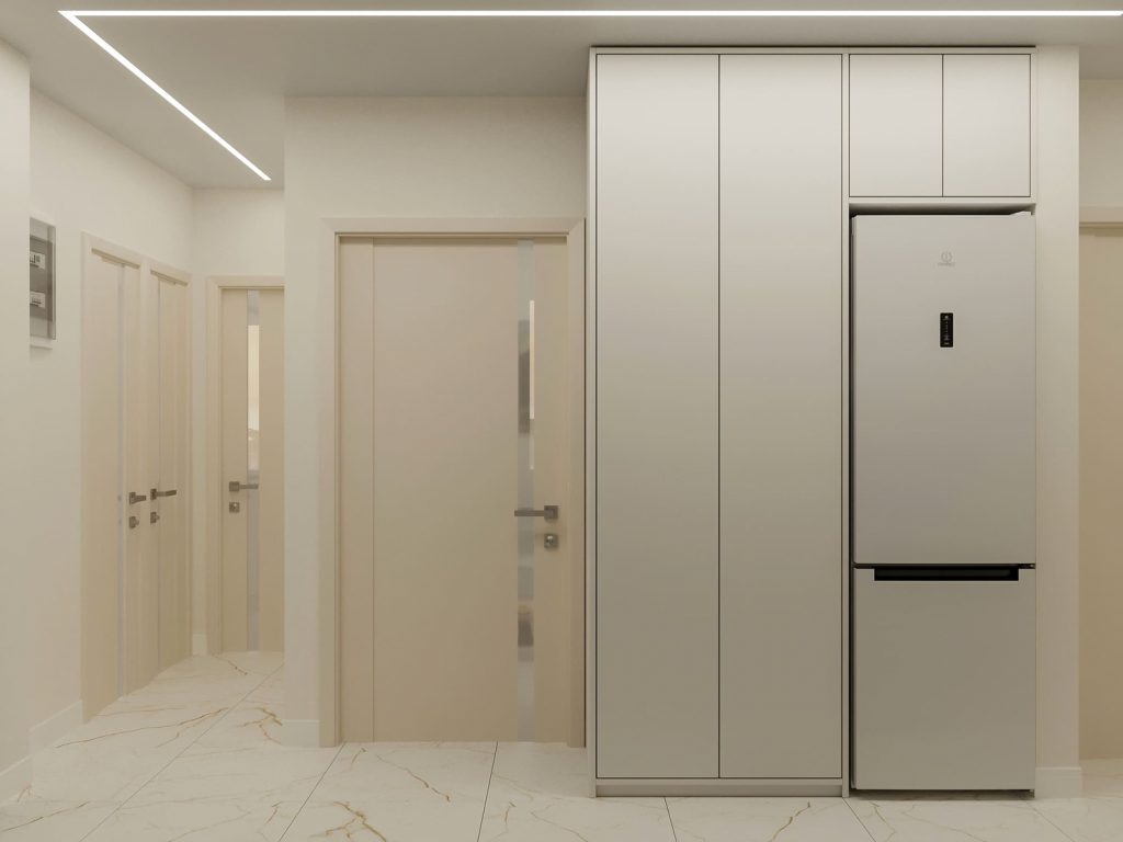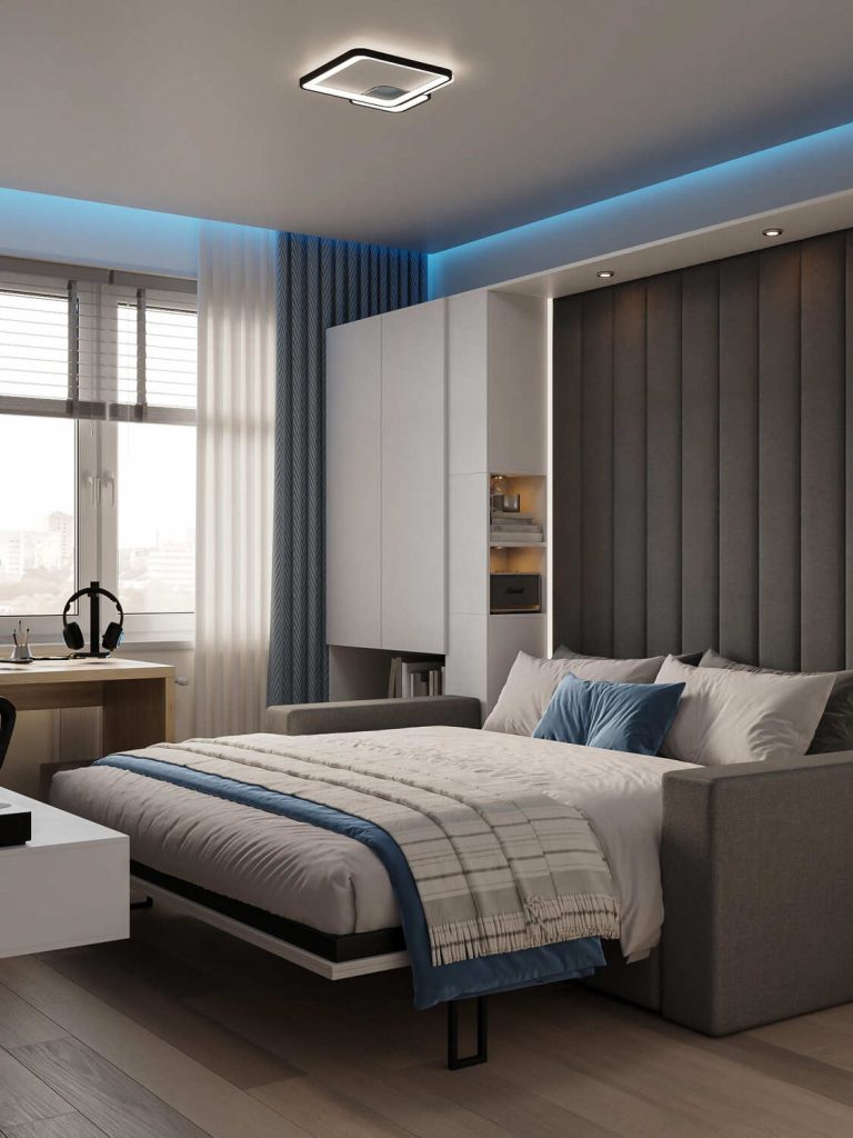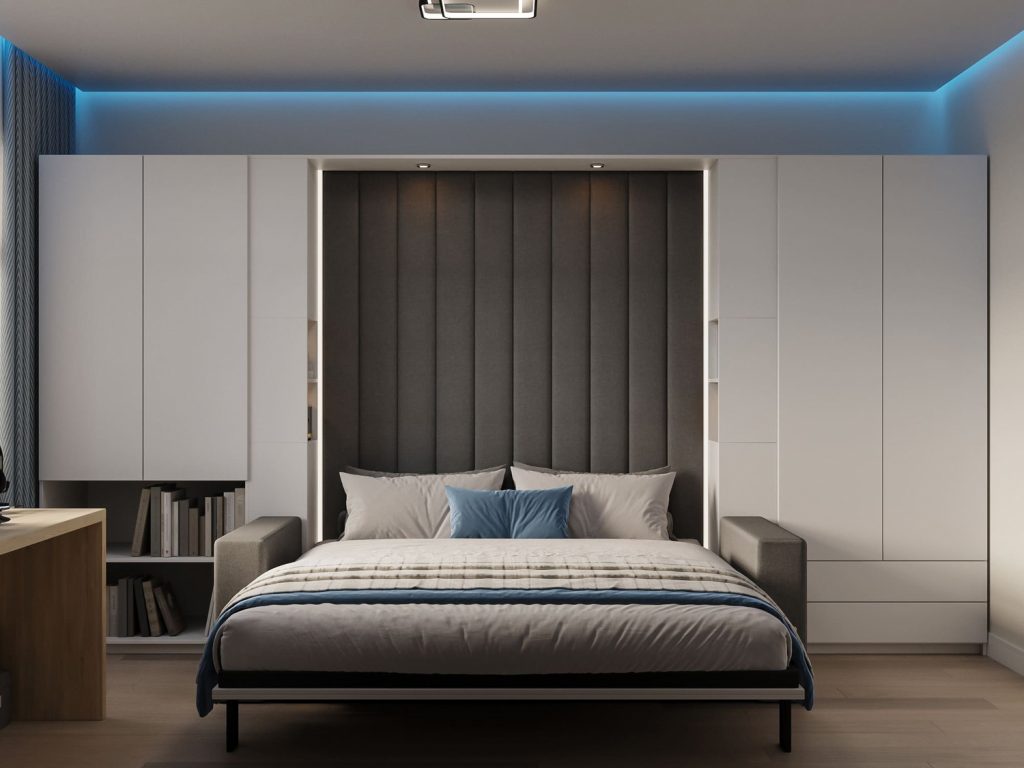 Особое внимание стоит уделить парящим потолкам с современным дизайном: они не только визуально увеличивают высоту помещения, но и добавляют мягкое, рассеянное освещение. Встроенные светодиодные ленты создают эффект воздушности, при этом сохраняя функциональность. Каждая деталь здесь направлена на улучшение комфорта и удобства, начиная от хранения вещей и заканчивая продуманным освещением, которое делает пространство стильным и уютным.