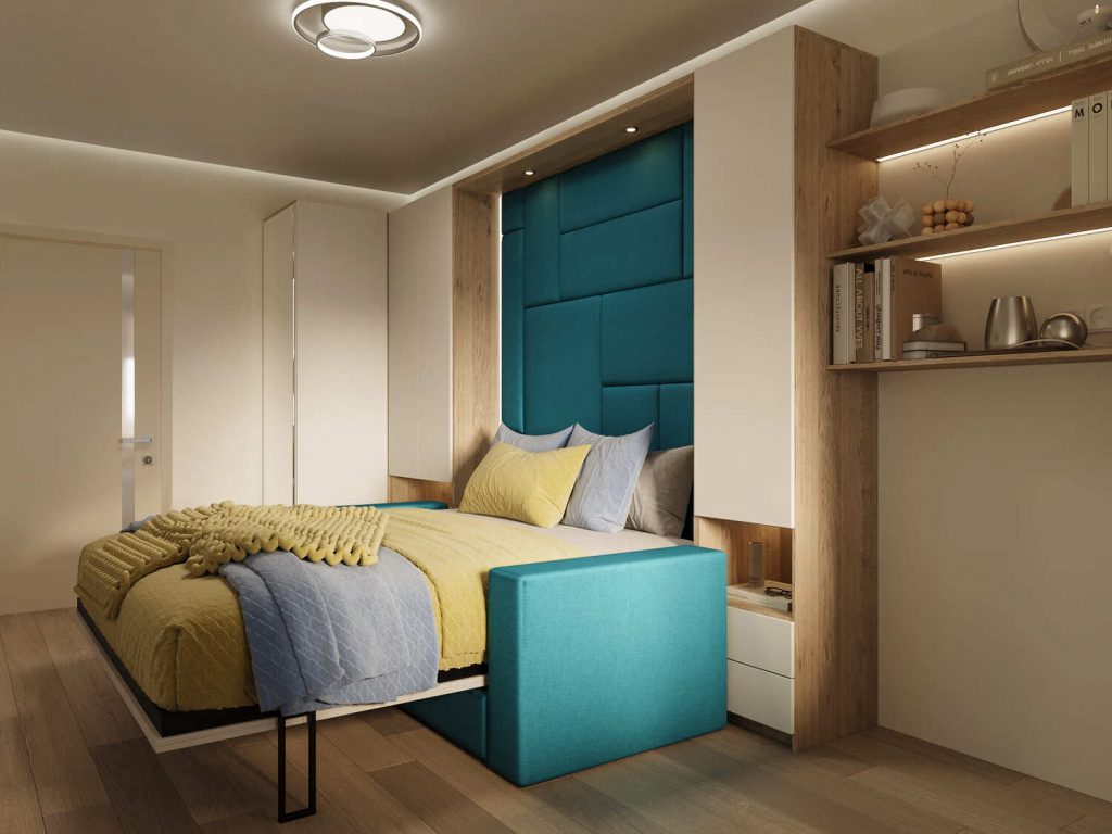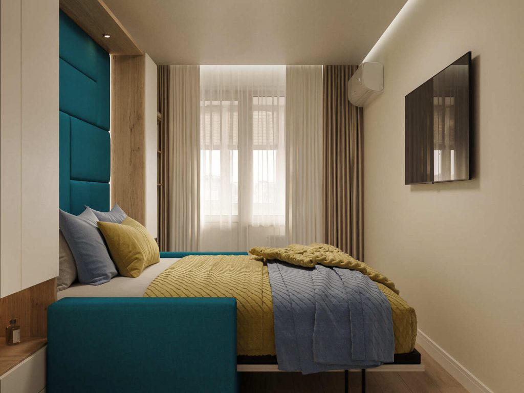 Спальня в этом проекте – это место для уюта и комфорта, идеально подходящее для отдыха. Основное внимание в интерьере привлекает кровать с яркой изголовьем в насыщенном бирюзовом цвете, которая становится акцентом всей комнаты. Простые, но элегантные текстуры на подушках и одеяле в пастельных оттенках создают гармонию и расслабляющую атмосферу.