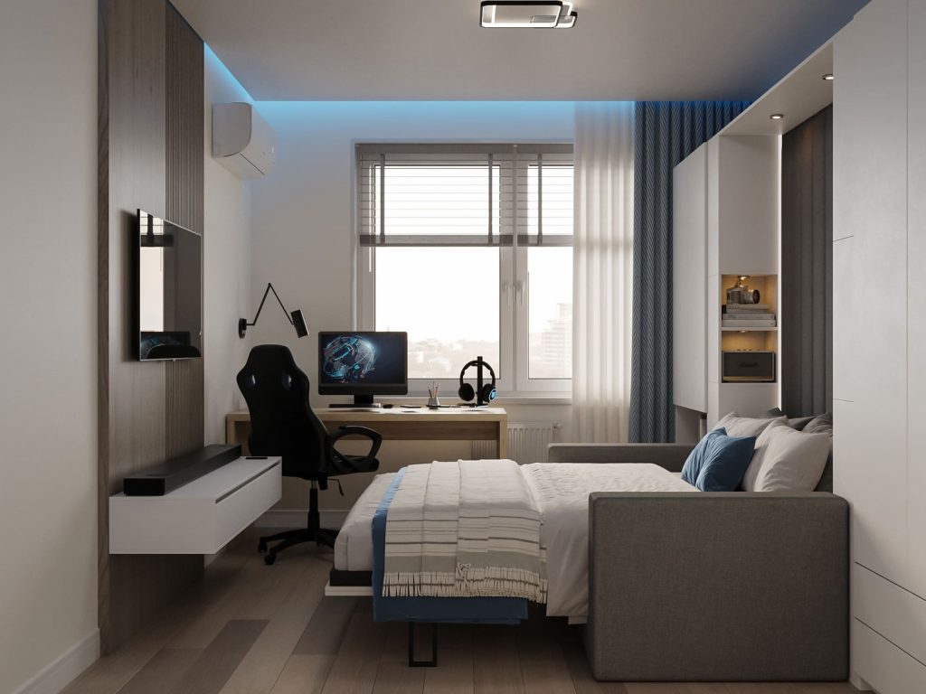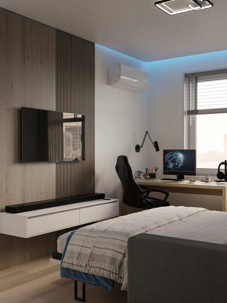 Стильные полки и органайзеры на стенах обеспечивают необходимое пространство для хранения, поддерживая порядок в комнате. Особое внимание уделено освещению: мягкая встроенная подсветка вдоль потолков и светильники создают атмосферу для отдыха и работы, подчеркивая стиль интерьера. Комната наполнена естественным светом благодаря большому окну, что делает пространство светлым и воздушным.
