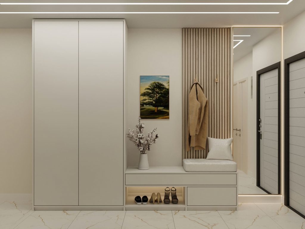 Дополнительная отделка в виде картины и стильных аксессуаров придает индивидуальность, подчеркивая теплую атмосферу прихожей.
