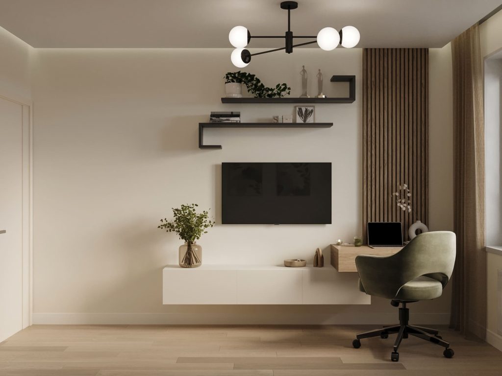 Особое внимание уделено освещению: потолочная люстра с минималистичным дизайном и встроенная подсветка вдоль стен создают мягкий свет, который прекрасно дополняет общую атмосферу. Компактный рабочий уголок с настольной лампой и стильным креслом добавляет удобства и функциональности, превращая гостиную в многофункциональное пространство.