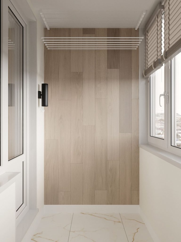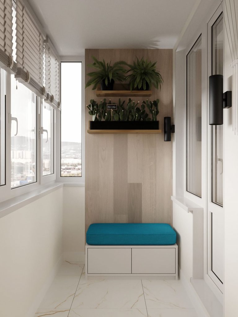 Балкон в этом проекте превращен в уютную зону для отдыха и ухода за растениями. Просторное окно пропускает много естественного света, создавая светлую и воздушную атмосферу. Растения на полках и специальное место для отдыха с ярким бирюзовым сиденьем добавляют комнате живости и зелени.