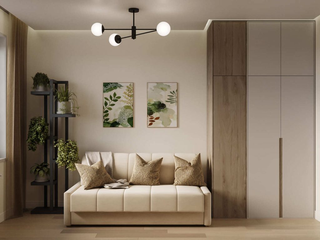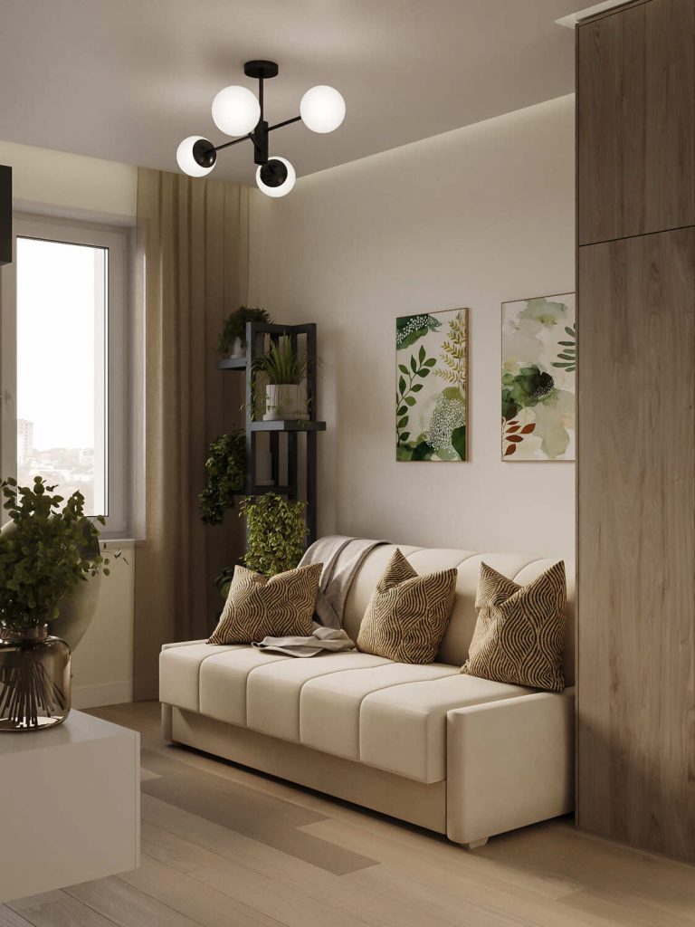 Гостиная в этом проекте – это пространство, где встречаются стиль и функциональность. Светлые тона стен и деревянные элементы создают ощущение уюта и гармонии. Комфортный диван с подушками в теплых оттенках прекрасно сочетает мягкость и визуальный акцент. Растения в стильных горшках добавляют зелени и живости, что идеально подходит для современной городской квартиры.