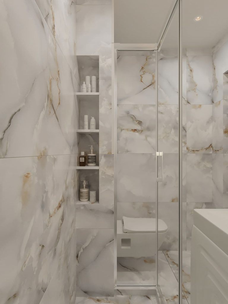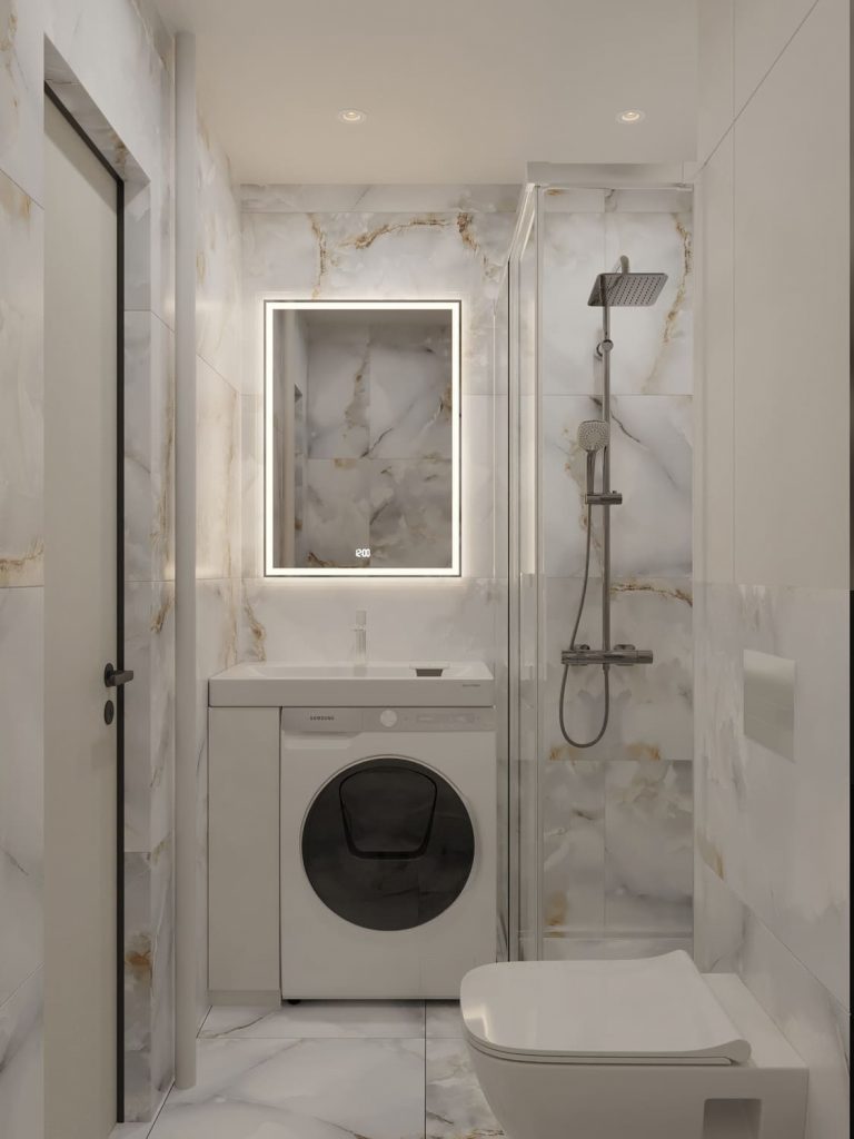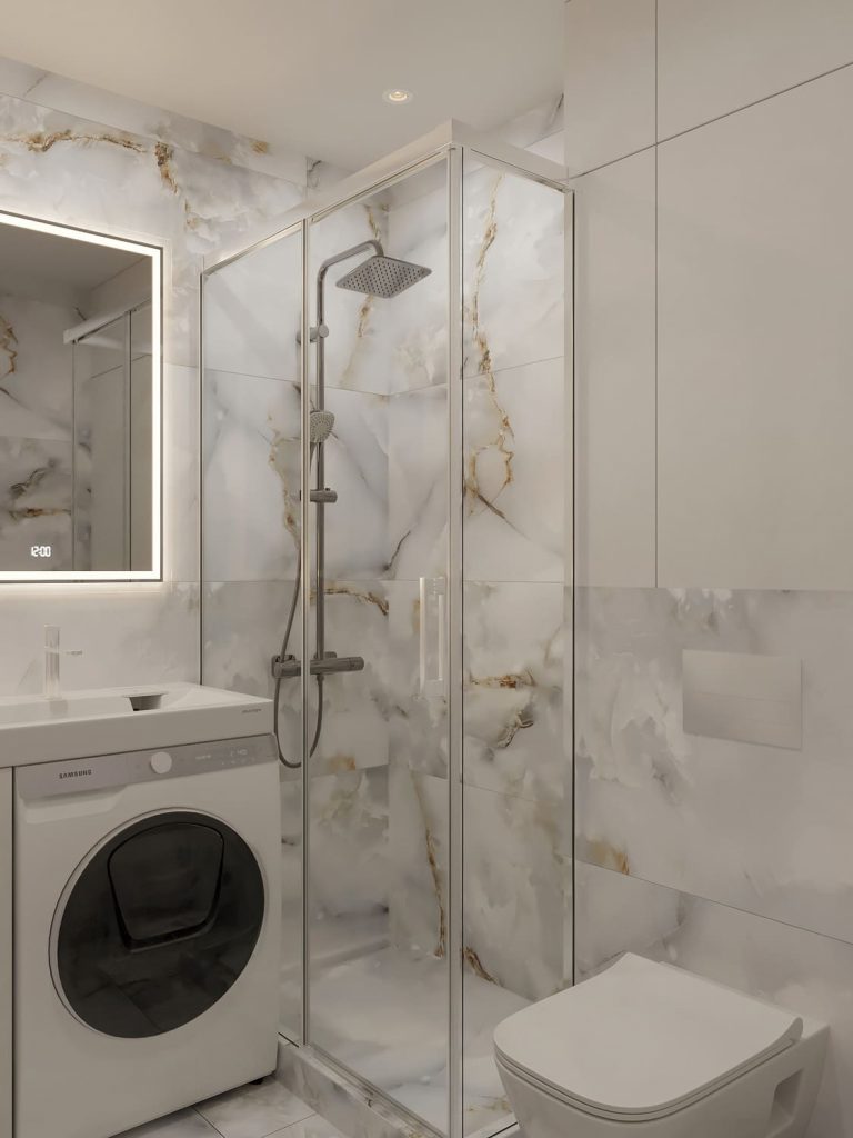 Основной акцент в санузле сделан на мраморную плитку с золотыми прожилками, которая придаёт интерьеру элегантность и визуально расширяет пространство. Несмотря на небольшую площадь, удалось разместить всё необходимое: вместительную душевую кабину, подвесной унитаз и удобную зону с раковиной и стиральной машиной.