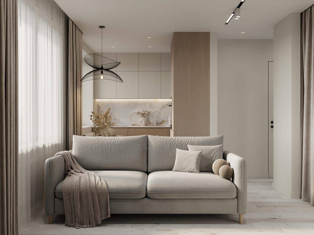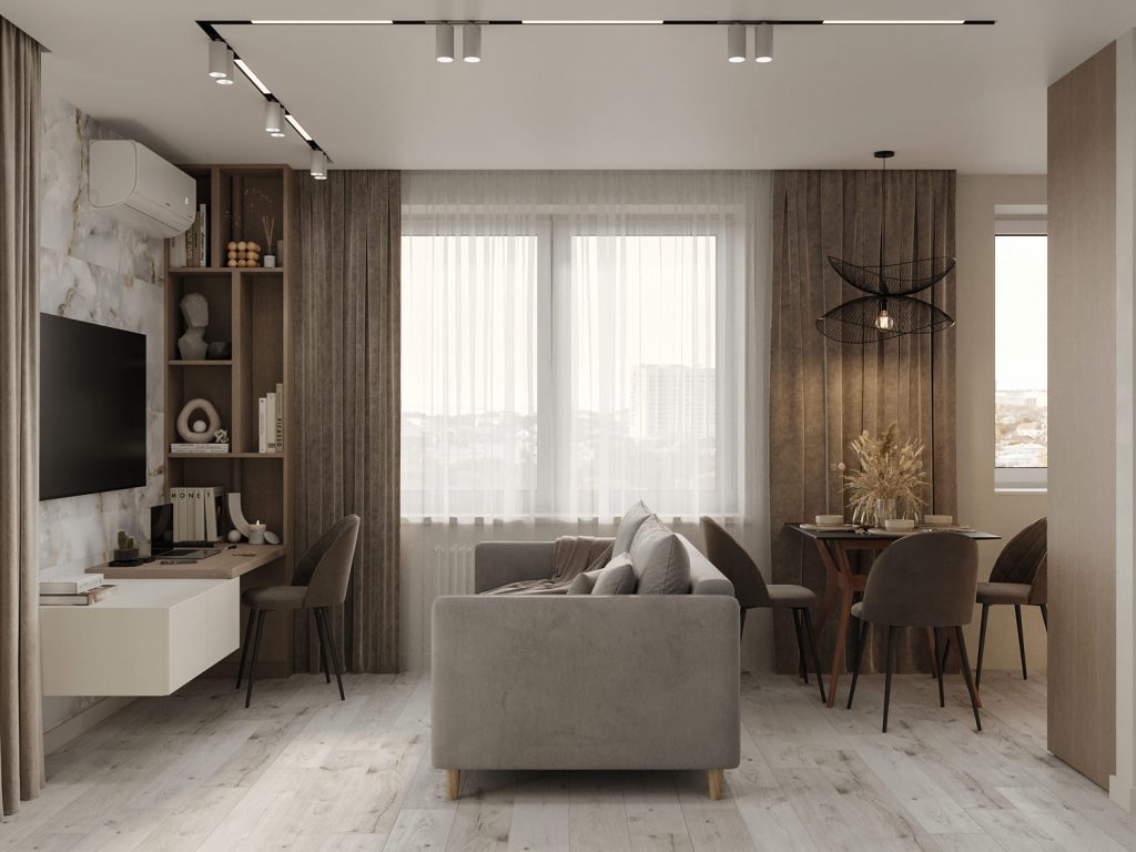 Большие окна пропускают много естественного света, а длинные портьеры в бежевых оттенках делают интерьер мягче. Современные потолочные светильники с направленным светом создают акцентное освещение, дополняя центральный подвесной светильник в кухонной зоне. В результате гостиная получилась стильной, уютной и удобной для жизни, оставаясь при этом лёгкой и ненавязчивой.