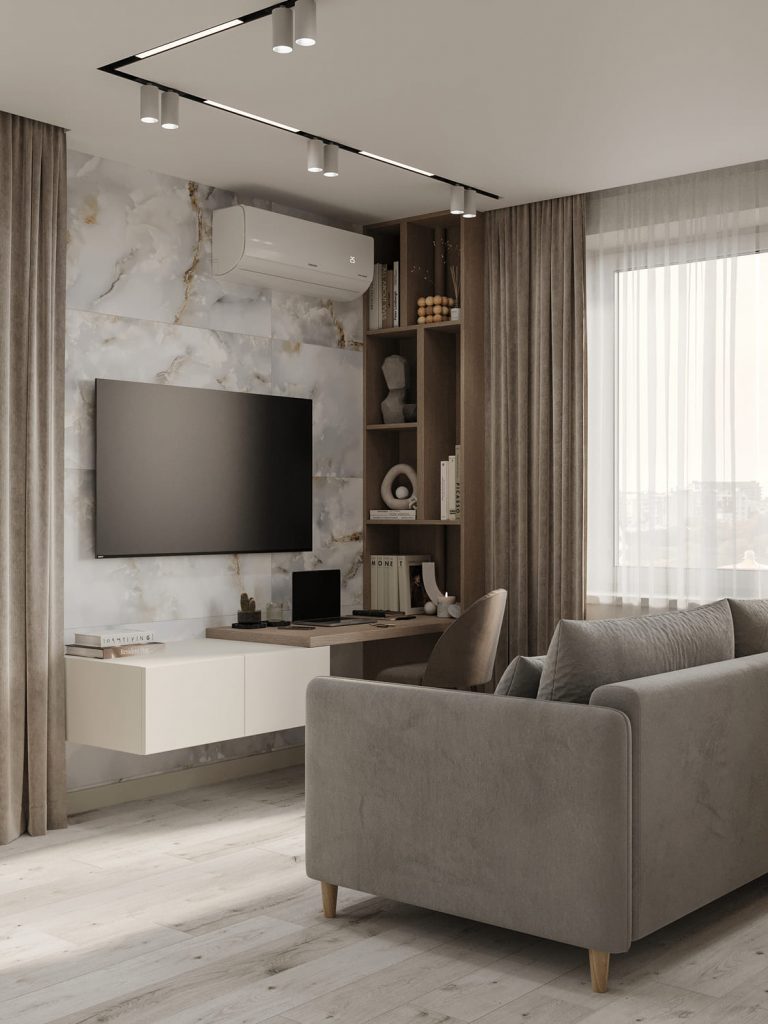 Фоновой основой для интерьера стали спокойные, нейтральные цвета, а текстуры дерева, мягких тканей и декоративного мрамора на стене добавляют пространству глубины. Телевизионная зона выполнена в лаконичном стиле: подвесная тумба делает интерьер лёгким, а встроенные полки с книгами и декором привносят нотку индивидуальности. Рабочее место у окна удачно интегрировано в интерьер, обеспечивая комфорт для учебы без перегруженности пространства.