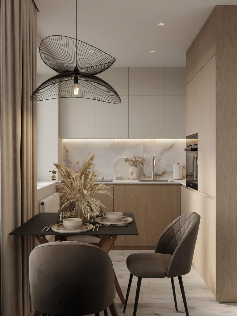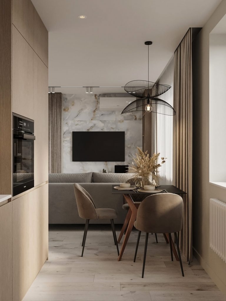Обеденная зона расположена у окна, что делает её особенно уютной. Компактный стол на деревянных ножках и бархатистые стулья мягкого бежевого оттенка создают комфортную обстановку для неспешных завтраков и ужинов в кругу семьи или друзей. Центральным элементом композиции становится подвесной светильник с ажурным чёрным абажуром, придающий интерьеру лёгкую динамику и акцентирующий внимание на обеденной группе.