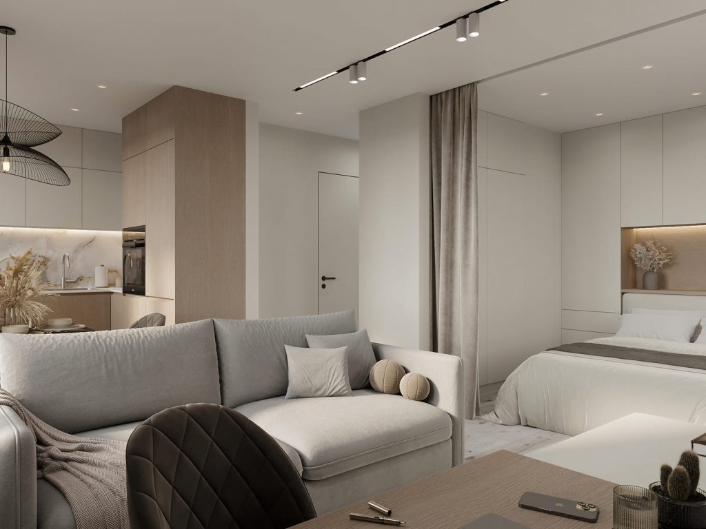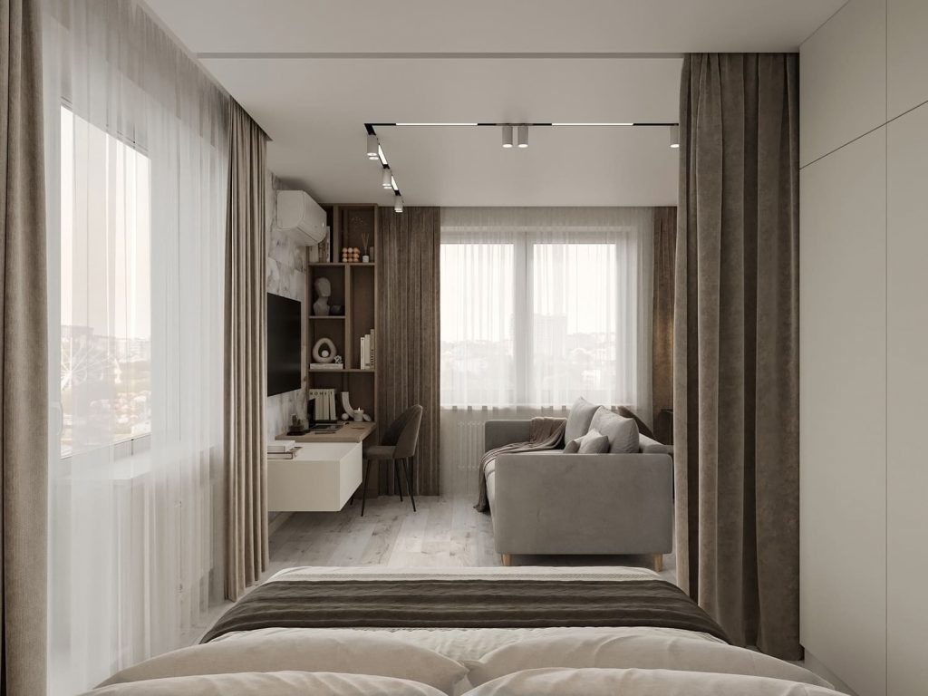 Грамотная перепланировка позволила объединить кухню и гостиную, выделить комфортную спальную зону и разместить всё необходимое для жизни и учебы. Светлые оттенки, натуральные текстуры и мягкие линии делают интерьер лёгким и воздушным, а продуманное зонирование помогает использовать каждый метр с максимальной пользой. Ванную заменили на душевую, встроенные системы хранения скрывают бытовые мелочи, а мебель и декор подобраны в спокойных натуральных оттенках. Здесь есть всё, чтобы отдыхать, учиться и наслаждаться комфортом в уютной атмосфере.