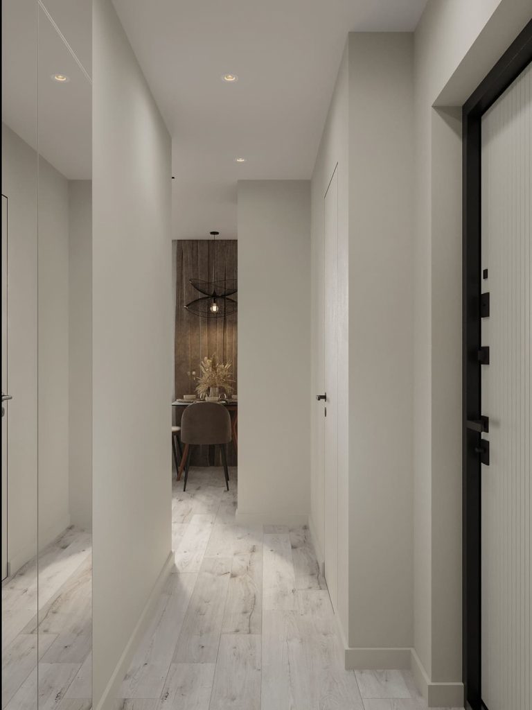 Прихожая этой квартиры сразу задаёт тон всему интерьеру: лаконичная, светлая и функциональная. Несмотря на небольшие размеры, здесь удалось грамотно организовать хранение и создать уютную атмосферу. Большое зеркало во всю высоту визуально расширяет пространство, делая узкий коридор светлее и просторнее. Открытая вешалка с деревянными рейками позволяет удобно разместить верхнюю одежду, а закрытый шкаф с зеркальными фасадами вмещает всё необходимое, включая сезонные вещи и хозяйственные принадлежности.