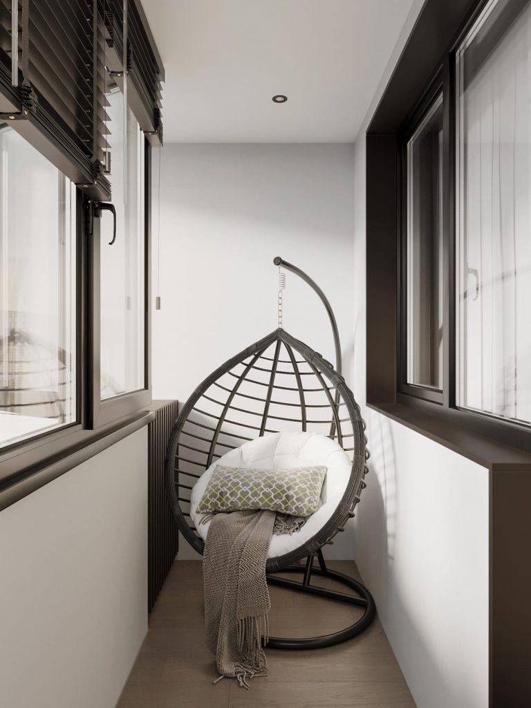 Главным акцентом балкона стал подвесной кресло-кокон с мягкими подушками и пледом, создающим уютную атмосферу. Его легкая, но прочная конструкция делает пространство воздушным и не загромождает интерьер.