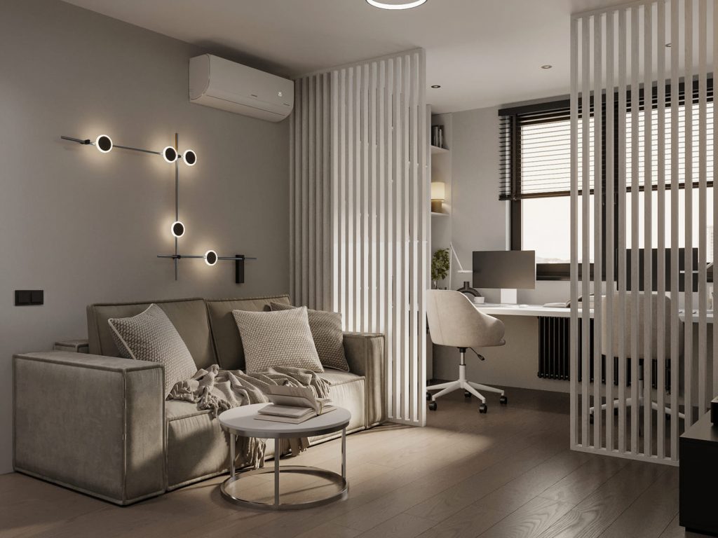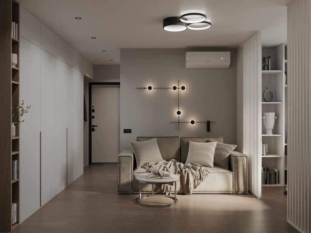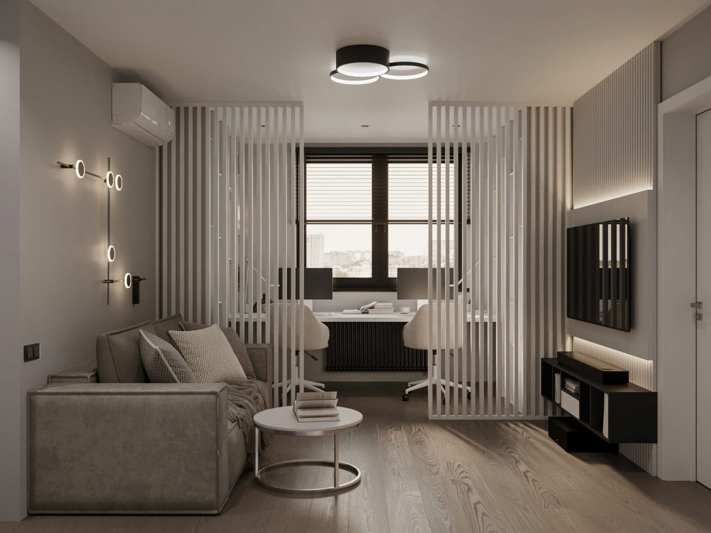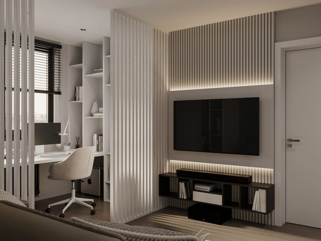 Гостиная – это сердце квартиры, объединяющее зону отдыха и рабочее пространство. Здесь удалось создать гармоничное сочетание уюта, функциональности и современного дизайна.