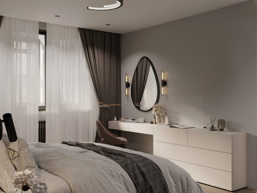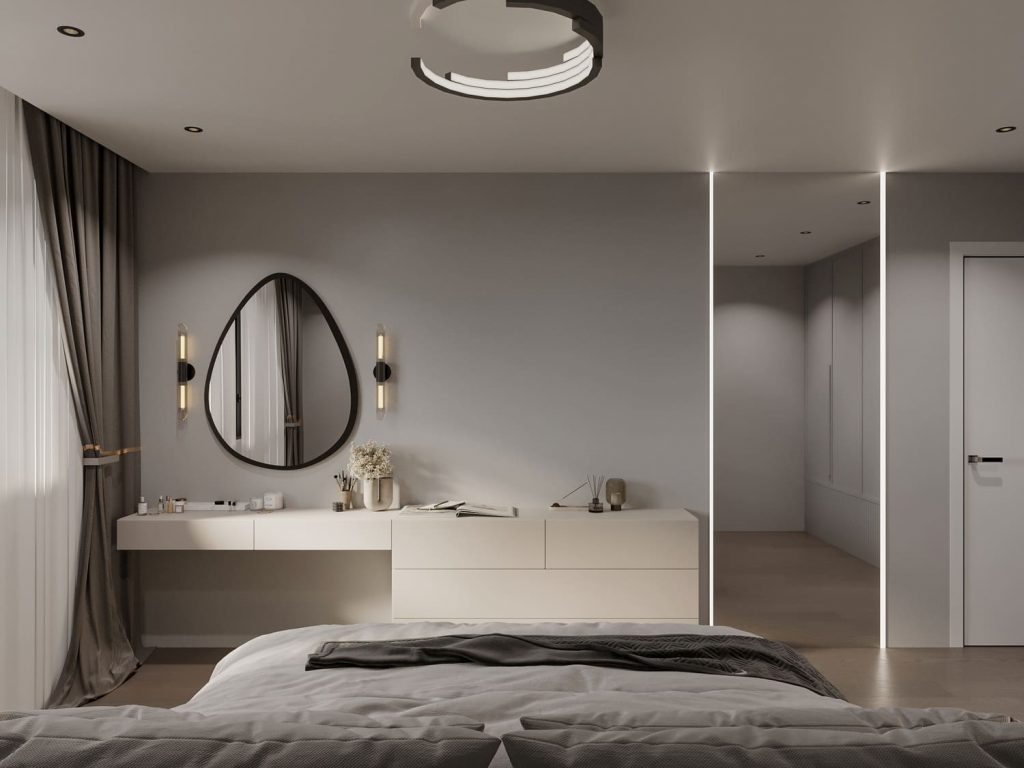 Женственная деталь в интерьере — туалетный столик с округлым зеркалом и мягким акцентным креслом. Подсветка вокруг зеркала делает эту зону удобной для утренних и вечерних ритуалов ухода.