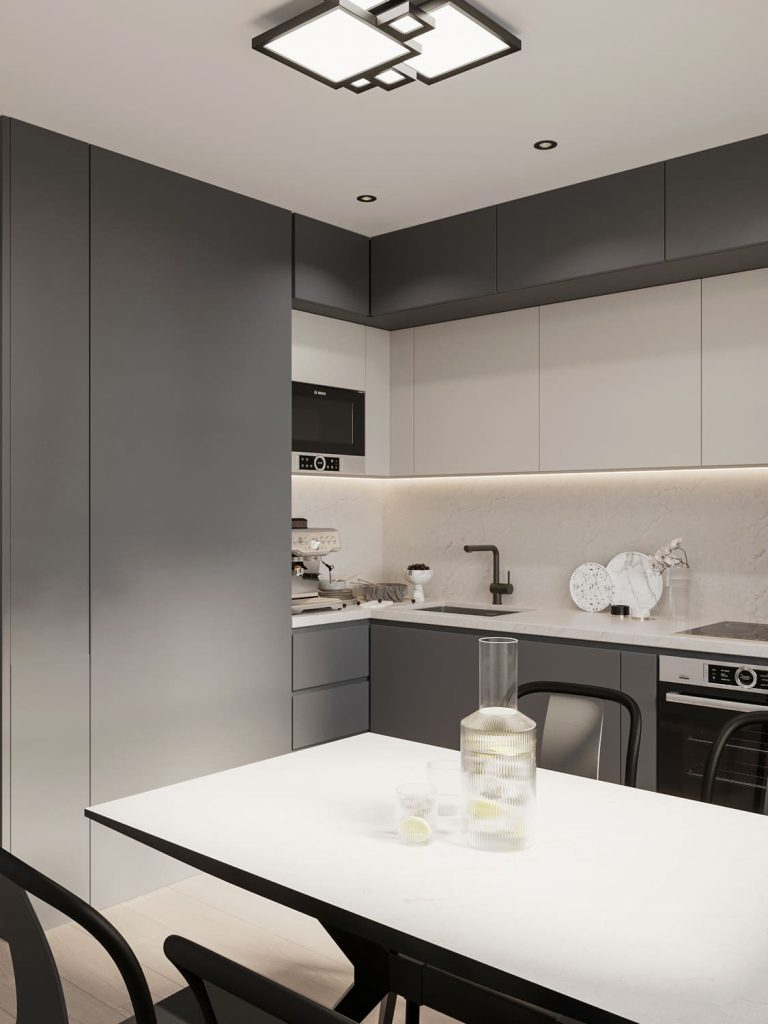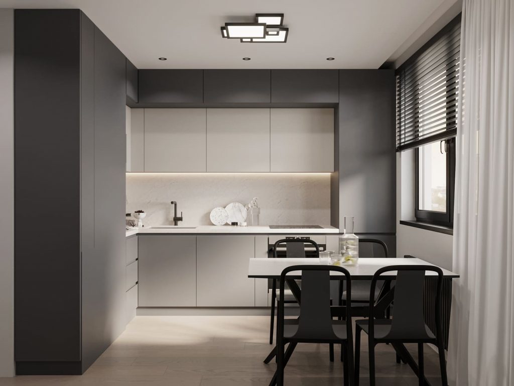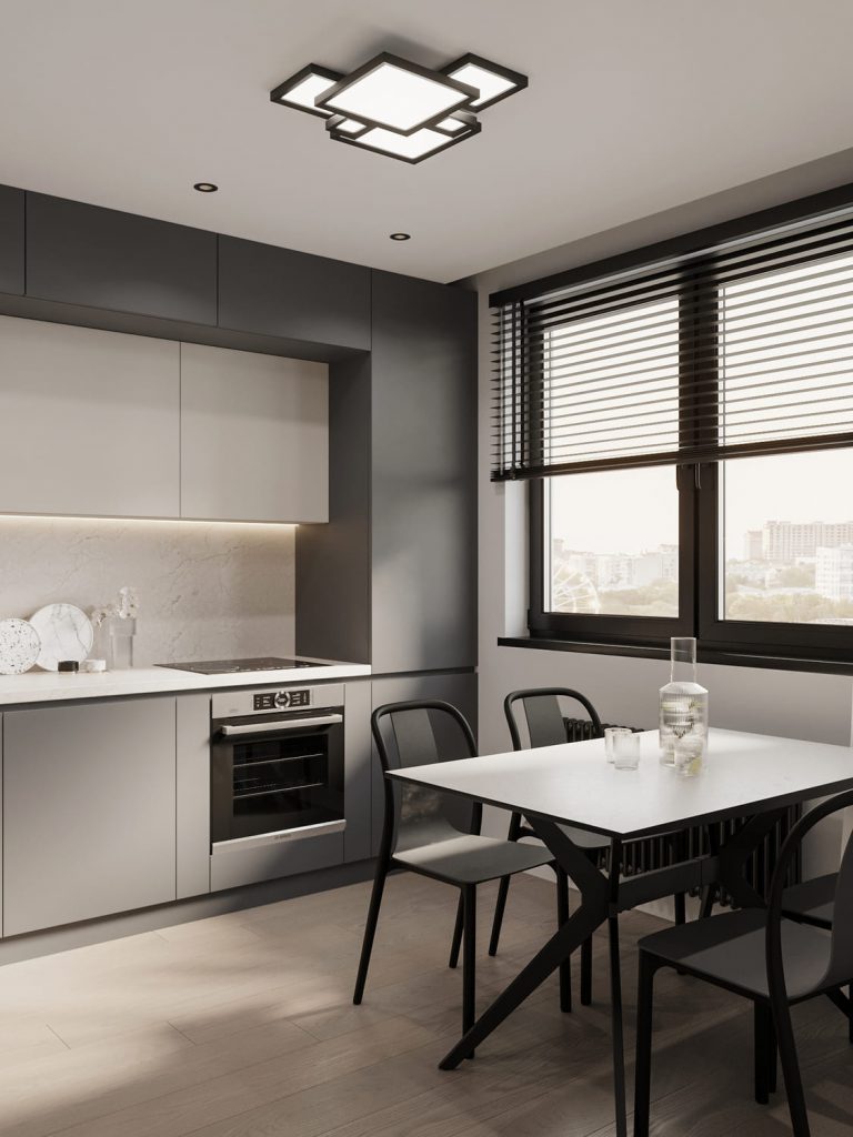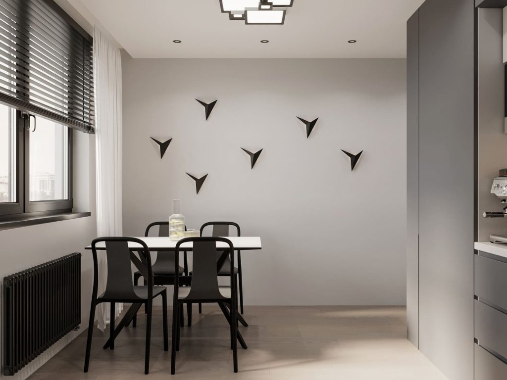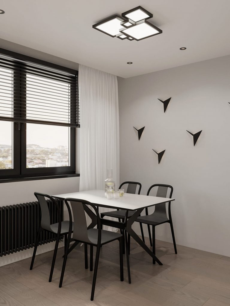 Обеденная зона компактно расположена у окна, позволяя наслаждаться естественным светом во время трапез. Чёрные стулья с графичными линиями поддерживают общее настроение интерьера, а белая столешница добавляет свежести. Геометрический светильник на потолке и настенные декоративные элементы делают пространство стильным и динамичным.