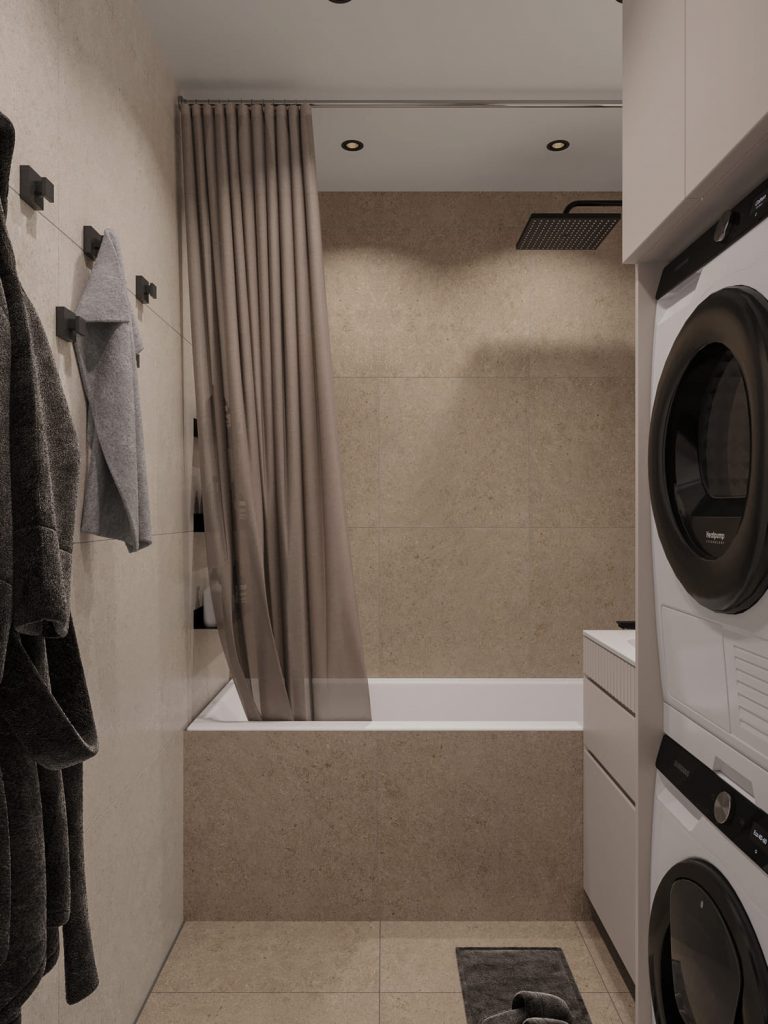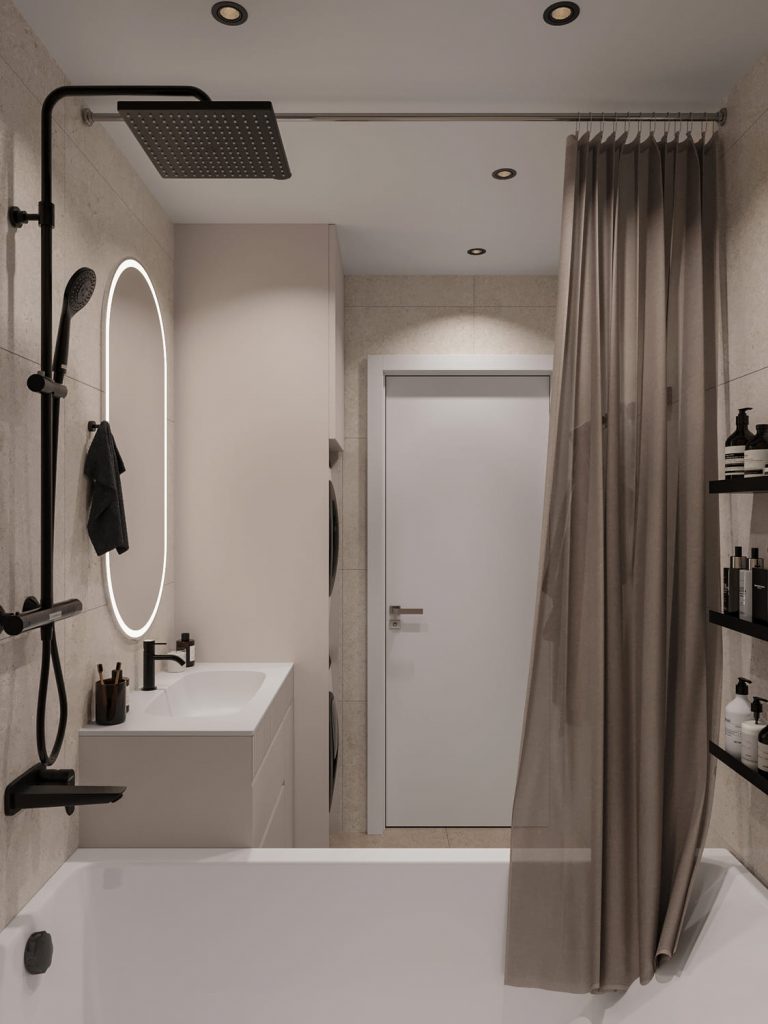 Нейтральные оттенки бежевого камня на стенах и полу создают ощущение тепла и уюта, а матово-черные акценты в смесителях, душевой системе и аксессуарах добавляют интерьеру характер и современность. Шторка для душа в приглушенном цвете дополняет натуральную гамму, поддерживая легкость и гармоничность оформления.