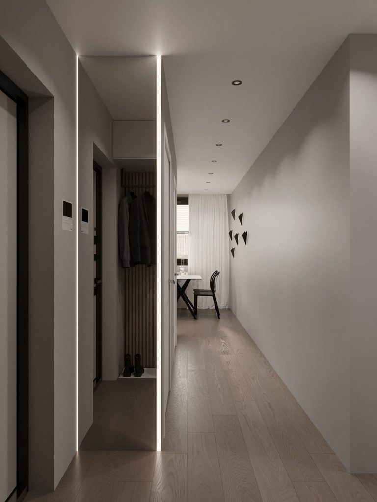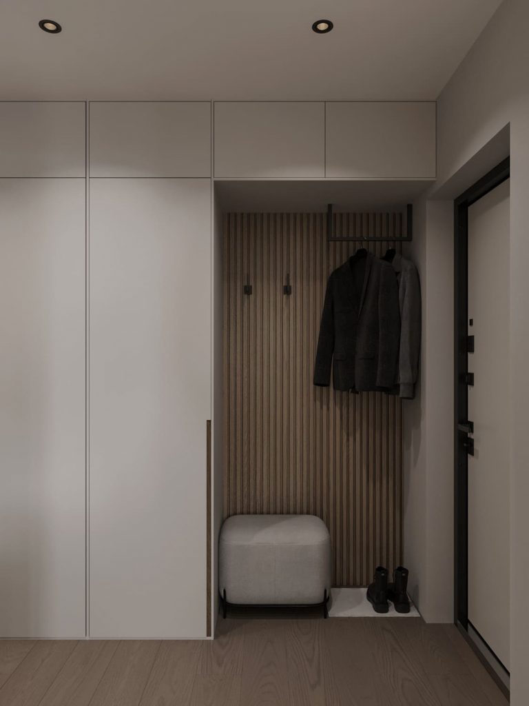 В просторной прихожей продумано все до мелочей: вместительный шкаф с лаконичными фасадами скрывает гардеробную зону, а открытая ниша с рейками из теплого дерева создает уютное место для хранения верхней одежды.