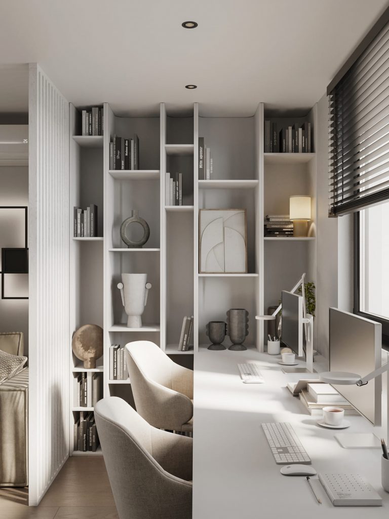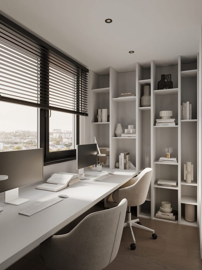 Кабинет аккуратно отделен декоративными рейками, которые зонируют пространство, но не утяжеляют интерьер. Просторный рабочий стол у окна рассчитан на двоих, а система хранения с открытыми полками позволяет удобно разместить книги и декор. Благодаря светлым оттенкам и естественному освещению здесь легко сосредоточиться на работе, не отвлекаясь на лишние детали.