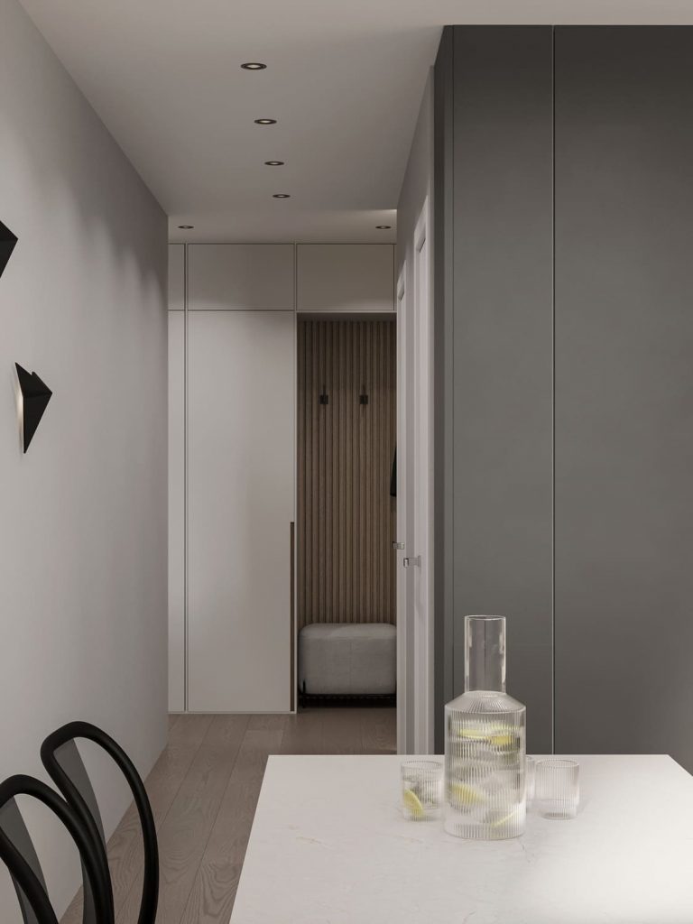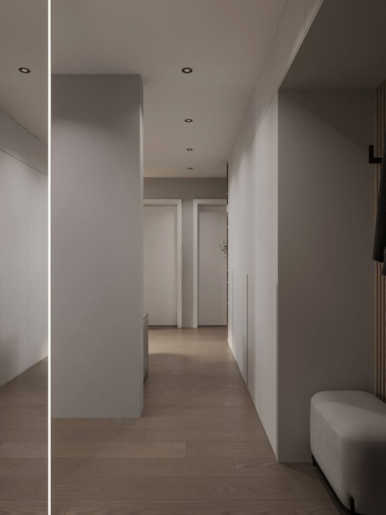 Общее цветовое решение в серо-бежевой гамме с акцентами натурального дерева делает прихожую гармоничной частью всего интерьера. Светлые стены и потолок усиливают ощущение простора, а точечные светильники обеспечивают равномерное освещение. В результате прихожая становится не просто проходным местом, а стильной и удобной частью дома, задающей тон всей квартире.