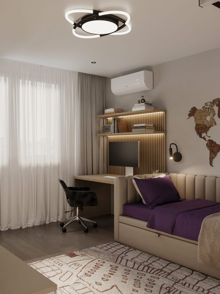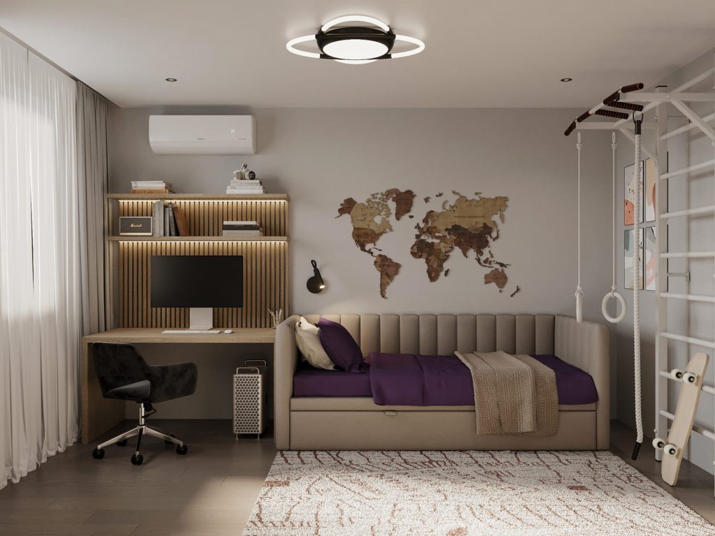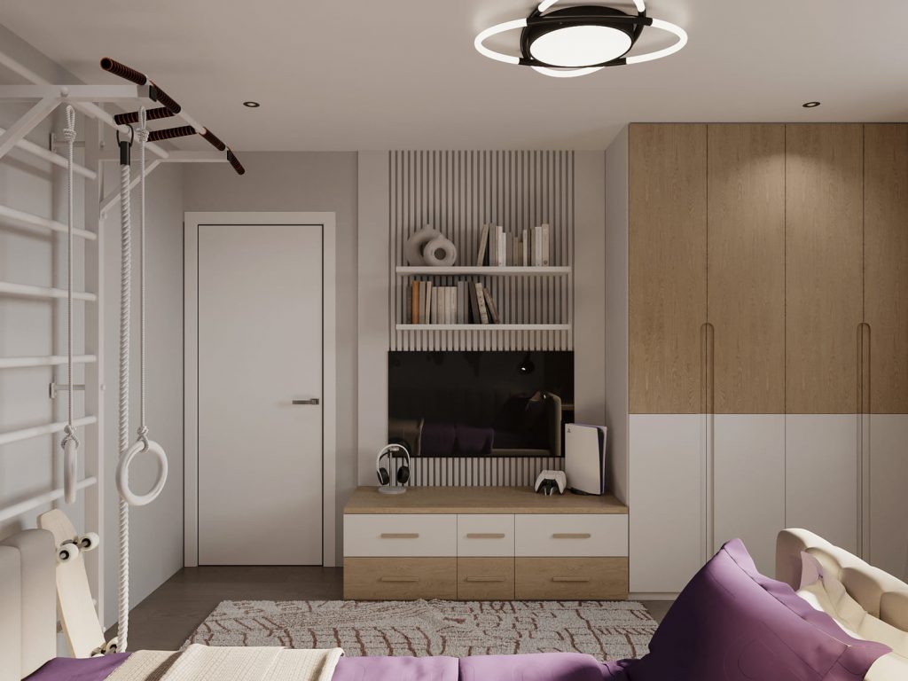 Эта детская комната создана для активного ребенка, который любит спорт, игры и учебу. Интерьер сочетает теплые древесные оттенки, нейтральную серо-бежевую гамму и контрастные акценты в глубоких лиловых тонах, придающих пространству индивидуальность.