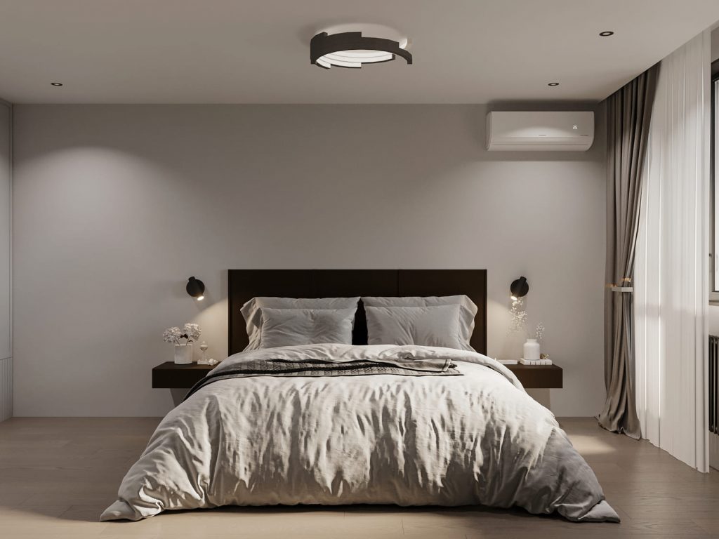Большая кровать с мягким текстильным изголовьем в темных оттенках становится главным акцентом интерьера в спальне. Легкое постельное белье в нейтральных тонах добавляет ощущение легкости и комфорта, а прикроватные тумбы с подвесной конструкцией создают эффект воздушности. Встроенные бра по обе стороны кровати обеспечивают мягкое точечное освещение для чтения перед сном.