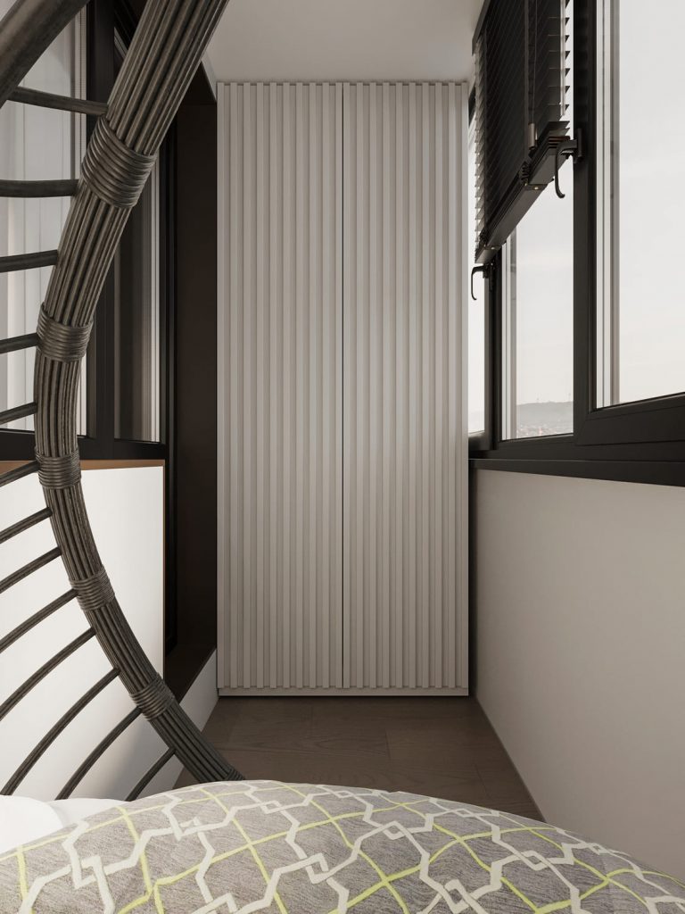 Минималистичное оформление позволило сохранить ощущение простора, а удобное кресло делает балкон полноценным местом для отдыха. Благодаря панорамному остеклению пространство наполняется естественным светом в любое время дня.
