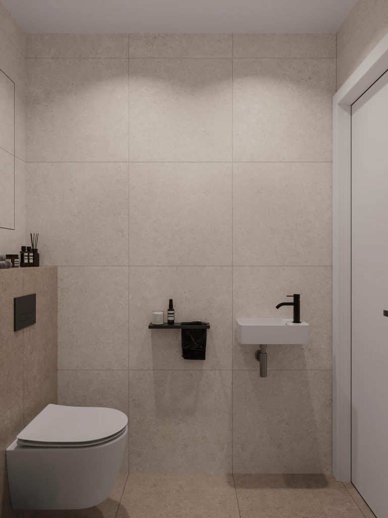 Подвесной унитаз визуально облегчает пространство и упрощает уборку. Встроенный люк на стене аккуратно скрывает технические коммуникации, сохраняя целостность дизайна. Минималистичная полочка над инсталляцией служит удобной поверхностью для хранения парфюма, свечей и декоративных аксессуаров.