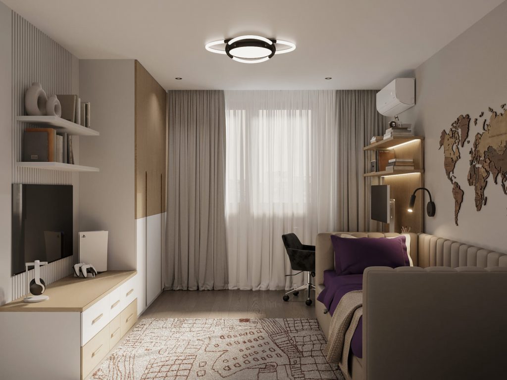 Кровать с мягким изголовьем и встроенными ящиками для хранения органично вписывается в интерьер. Над кроватью расположена декоративная карта мира, вдохновляющая на путешествия и познание нового. Акцентные подушки и уютный плед делают зону отдыха еще комфортнее.
