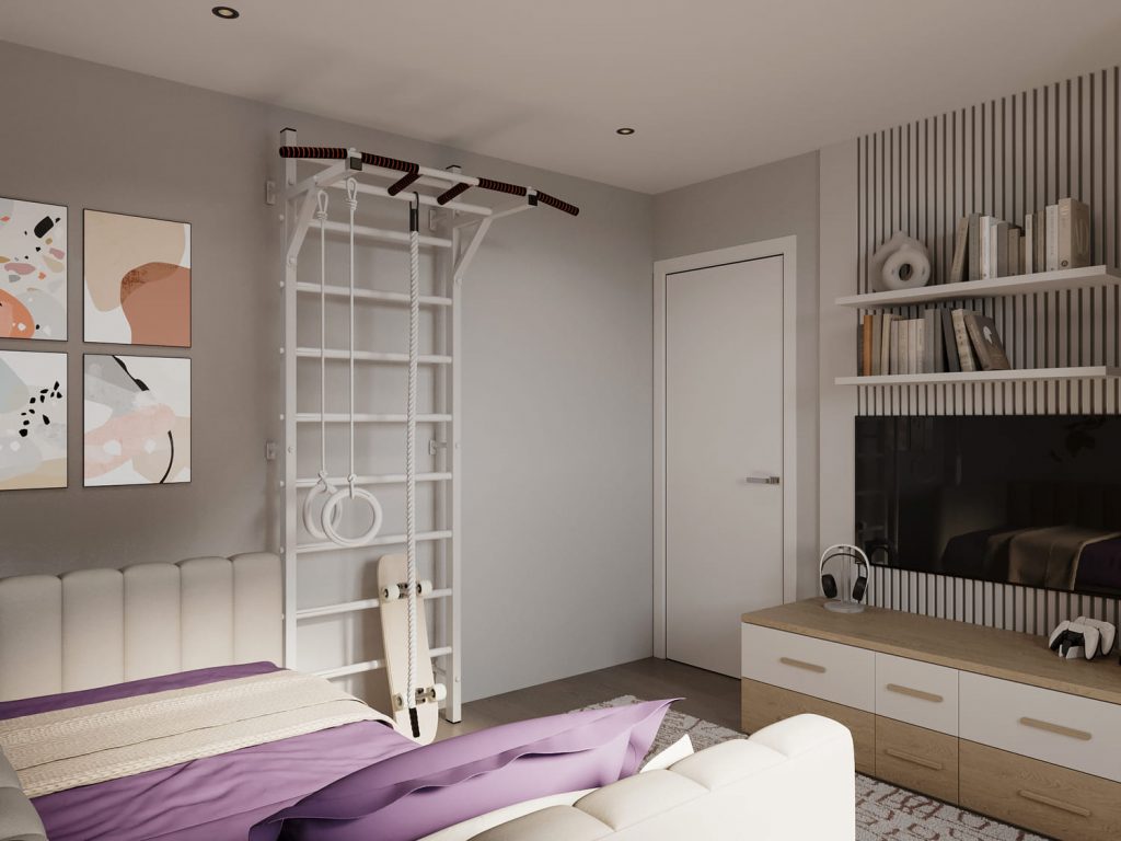 Для физической активности в комнате предусмотрен компактный спортивный комплекс с турником, канатом и кольцами. Это не только элемент дизайна, но и возможность для ребенка развивать координацию и силу, не выходя из дома.