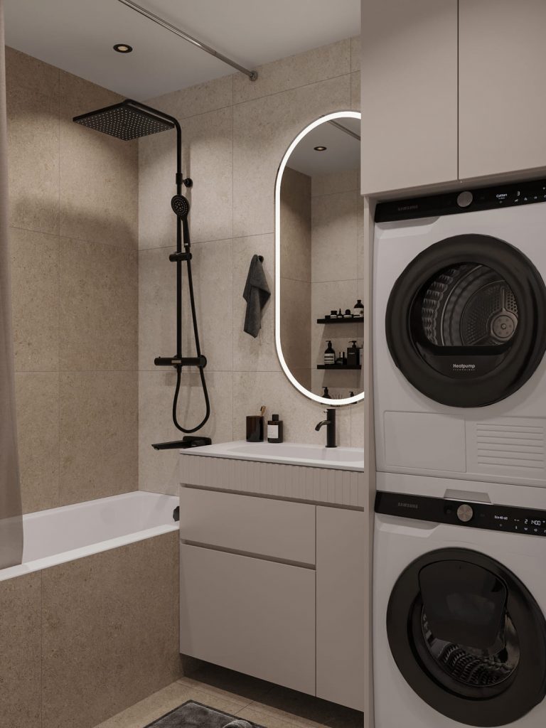 Встроенный шкаф аккуратно скрывает стиральную и сушильную машины, сохраняя эстетику интерьера. Закрытые фасады предотвращают визуальный шум, а верхние секции дают дополнительное место для хранения бытовой химии и полотенец.