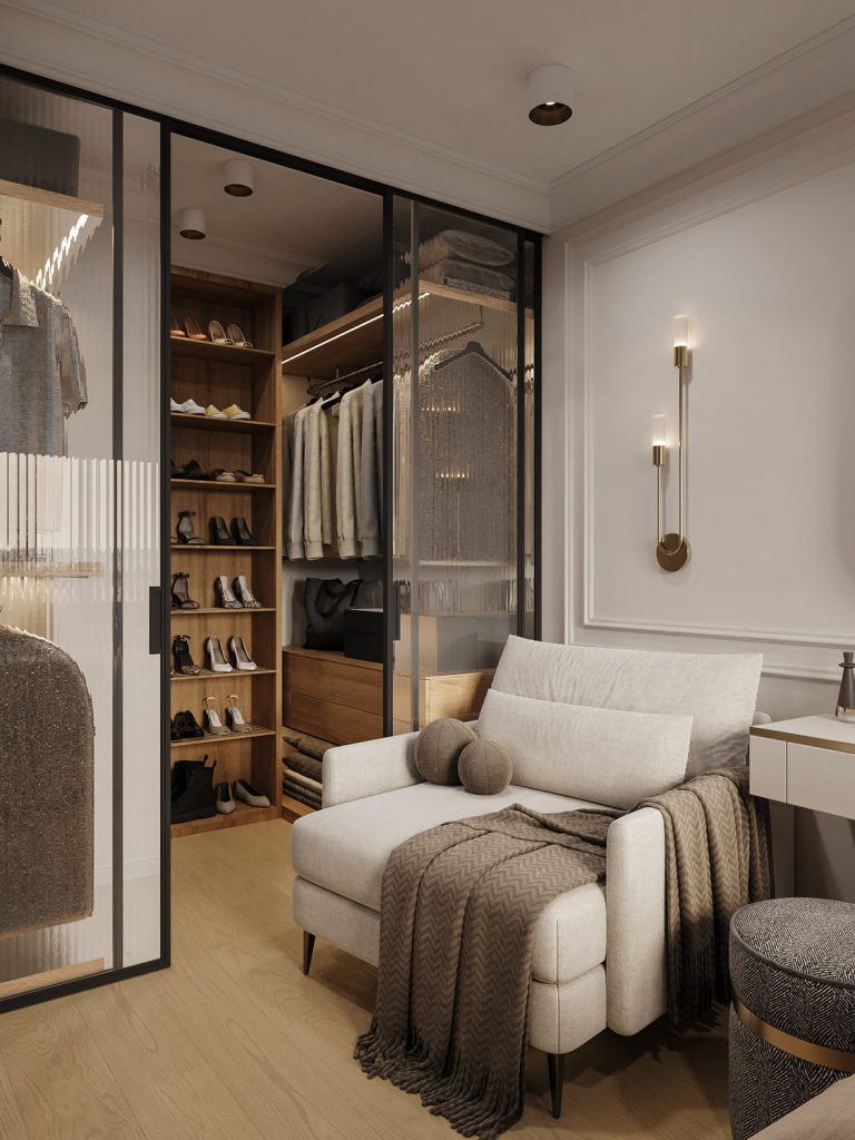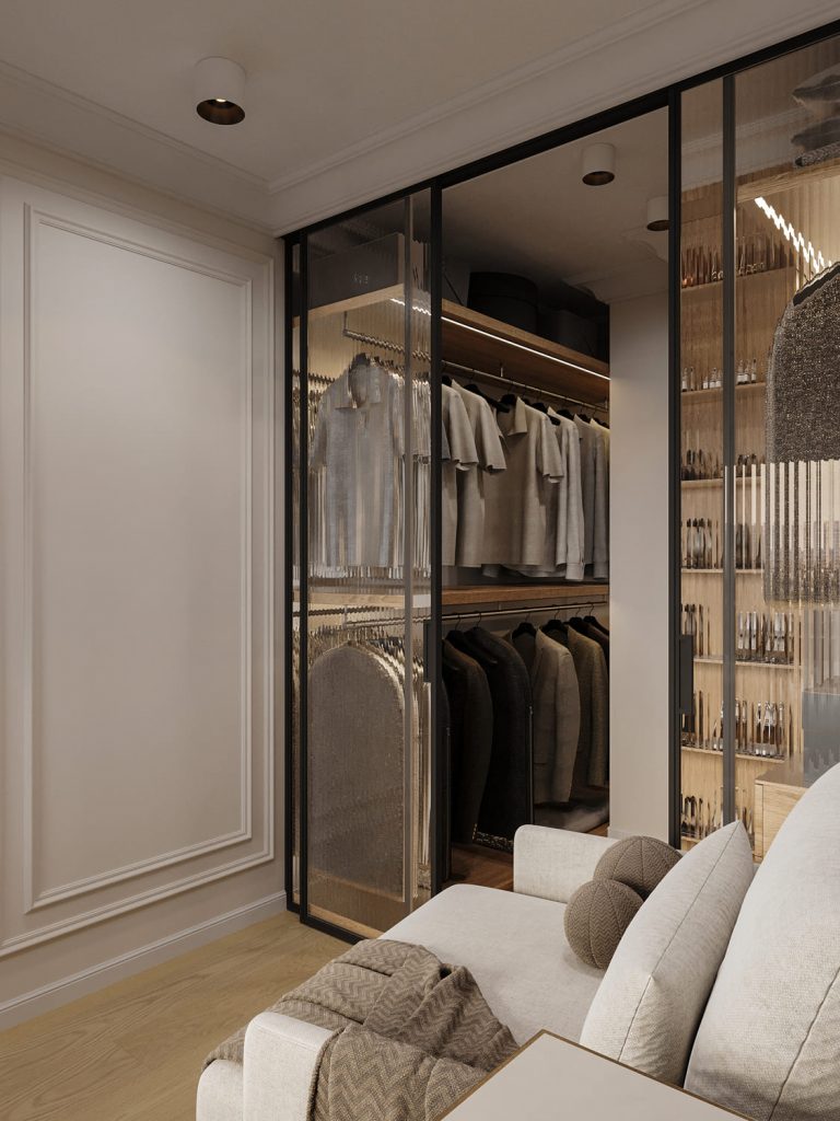 Планировка продумана до мелочей: у окна расположено изголовье кровати с деревянной отделкой, а рядом — открытая система хранения с полками, которая добавляет ритм и становится акцентом стены. Напротив кровати — полноценная гардеробная, отделённая стеклянными раздвижными перегородками с рифлёным стеклом в чёрной рамке. Такое решение визуально облегчает зону хранения и не «съедает» пространство комнаты.