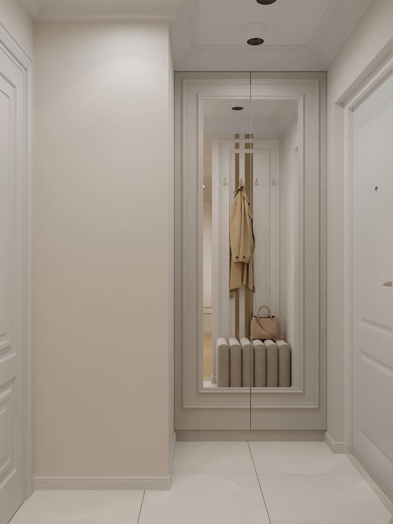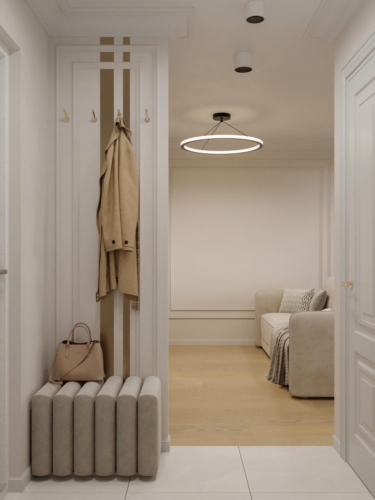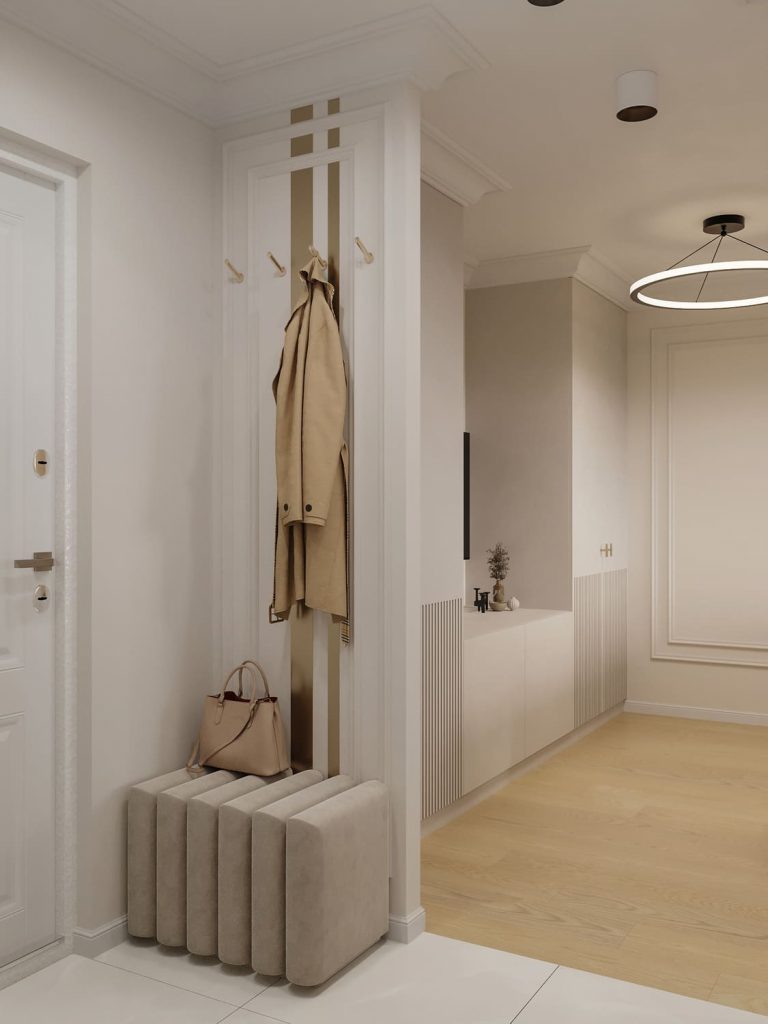 С первого шага в квартиру создаётся ощущение уюта и порядка — прихожая оформлена сдержанно, но элегантно. Базовые светлые оттенки стен визуально расширяют пространство, а вертикальные элементы — как на декоративной панели с крючками — подчёркивают высоту потолков.