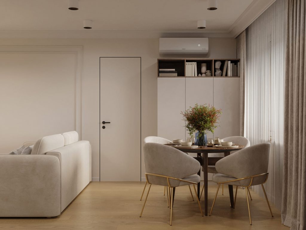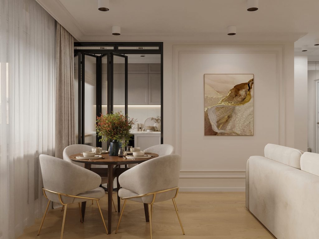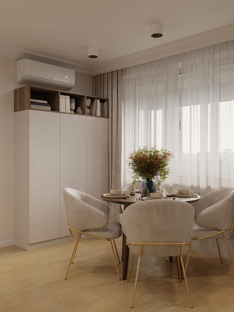Обеденный стол из натурального дерева с матовой поверхностью органично вписался у окна. Вокруг — мягкие кресла с бархатистой обивкой и золотистыми ножками: классика, но с актуальным современным оттенком. Композицию завершает круглый подвесной светильник — лёгкий, но выразительный акцент, который поддерживает геометрию обеденной группы и визуально объединяет зону.