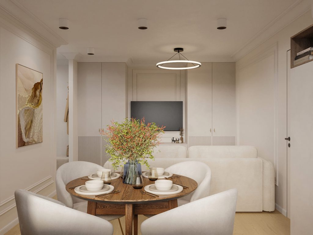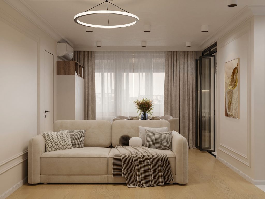 Дизайн-проект двухкомнатной квартиры в хрущевке под сдачу в стиле современной классики с нейтральной палитрой с молдингами, текстилем с рельефом и фрезеровкой фасадов с прихожей, кухней, гостиной, спальней, санузлом и балконом
