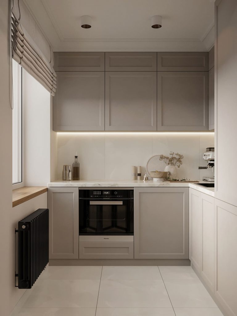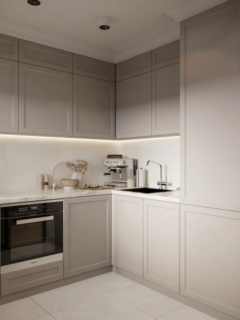 Фасады выполнены в спокойных серо-бежевых тонах с классической филёнкой — это отсылка к классике, адаптированная под современные реалии. Столешница и фартук — из материала с лёгким мраморным рисунком, что придаёт интерьеру нотку благородства. Подсветка под шкафами создаёт комфортный рабочий свет и подчёркивает фактуру поверхностей.