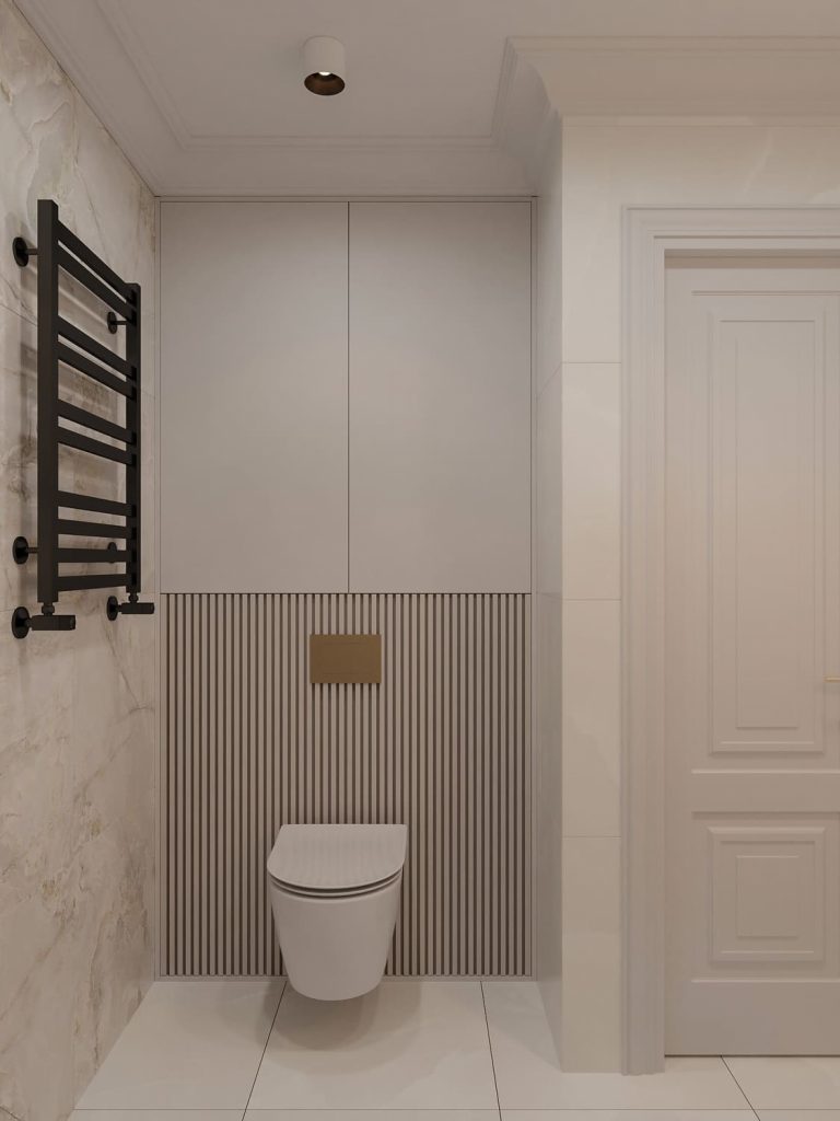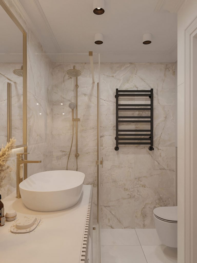 Главным акцентом стали стены с отделкой под светлый мрамор с мягкими бежево-золотистыми прожилками. Этот рисунок придаёт помещению дорогой, благородный вид. Душевая выделена стеклянной перегородкой с тонким профилем, а вся сантехника — в благородном матовом золоте: изысканный контраст к мрамору и светлым поверхностям.