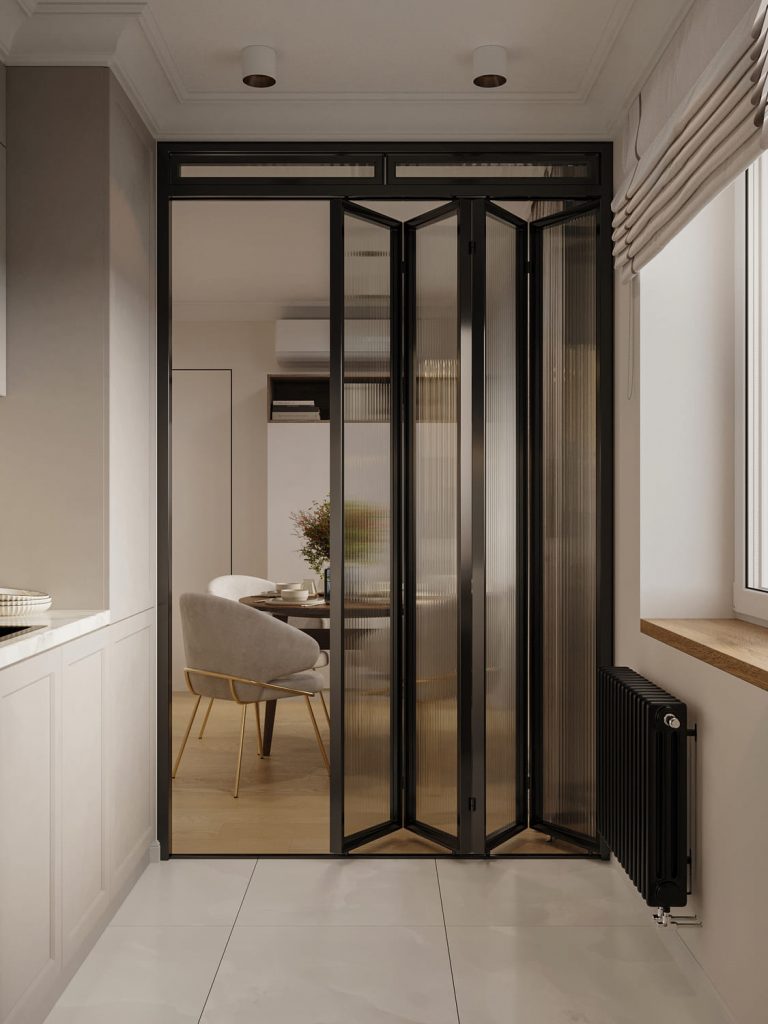 Особое внимание заслуживает стеклянная перегородка между кухней и гостиной: она обеспечивает безопасность (по нормам при наличии газовой плиты), но при этом сохраняет ощущение единого пространства. Черная металлическая рамка и рифлёное стекло придают кухне характер и добавляют выразительности в общий интерьер.