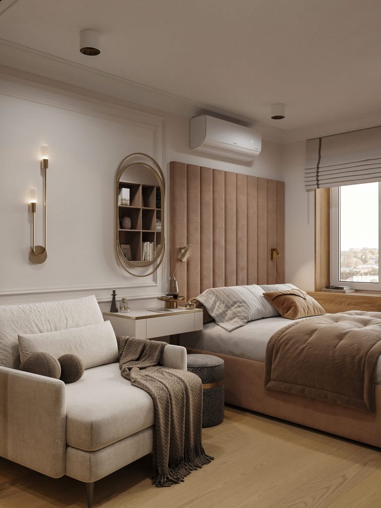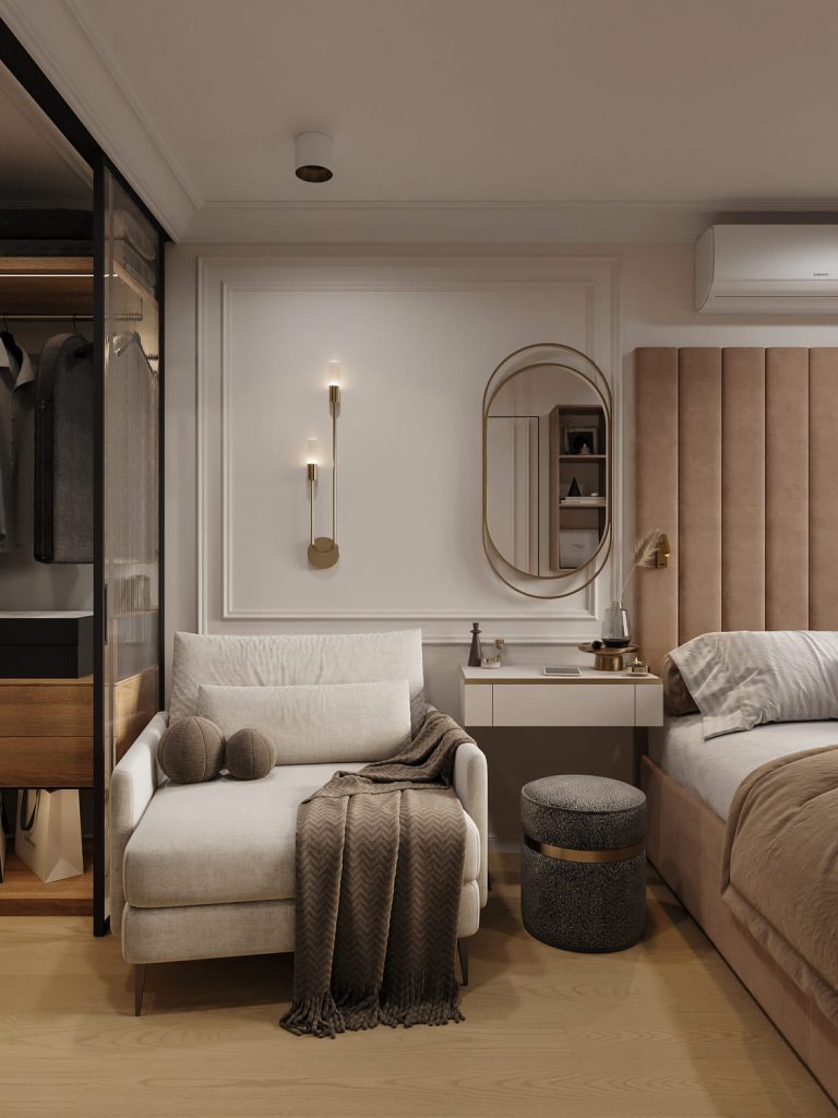Здесь же — уютное кресло с декоративными подушками и мягким пледом: оно создаёт атмосферу «домашнего уголка» для чтения или отдыха. Рядом — подвесной туалетный столик с латунным обрамлением и овальное зеркало в тон: всё компактно, но эстетично и удобно. Завершают композицию бра с латунным основанием — изящные и лёгкие, они отлично поддерживают общий стиль комнаты.