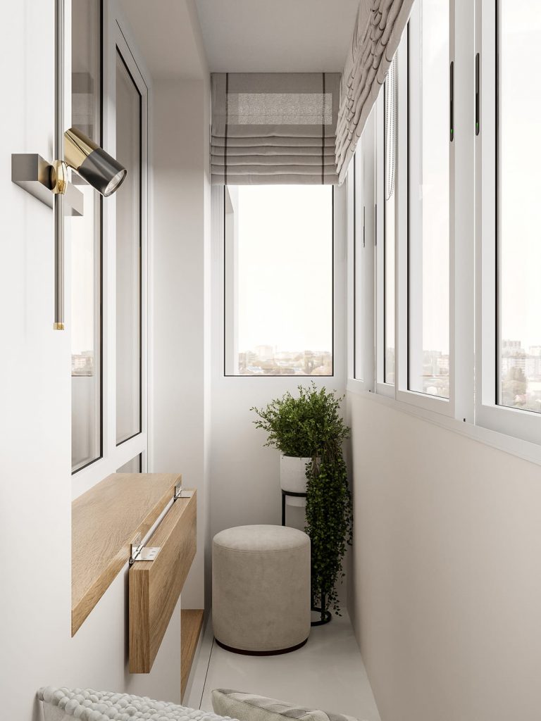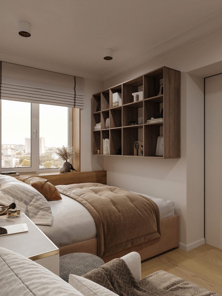Оформление продолжает заданную бежево-серо-древесную палитру: римские шторы приглушают солнечный свет, латунные светильники обеспечивают уютное вечернее освещение, а живые растения добавляют уюта и визуальной мягкости.