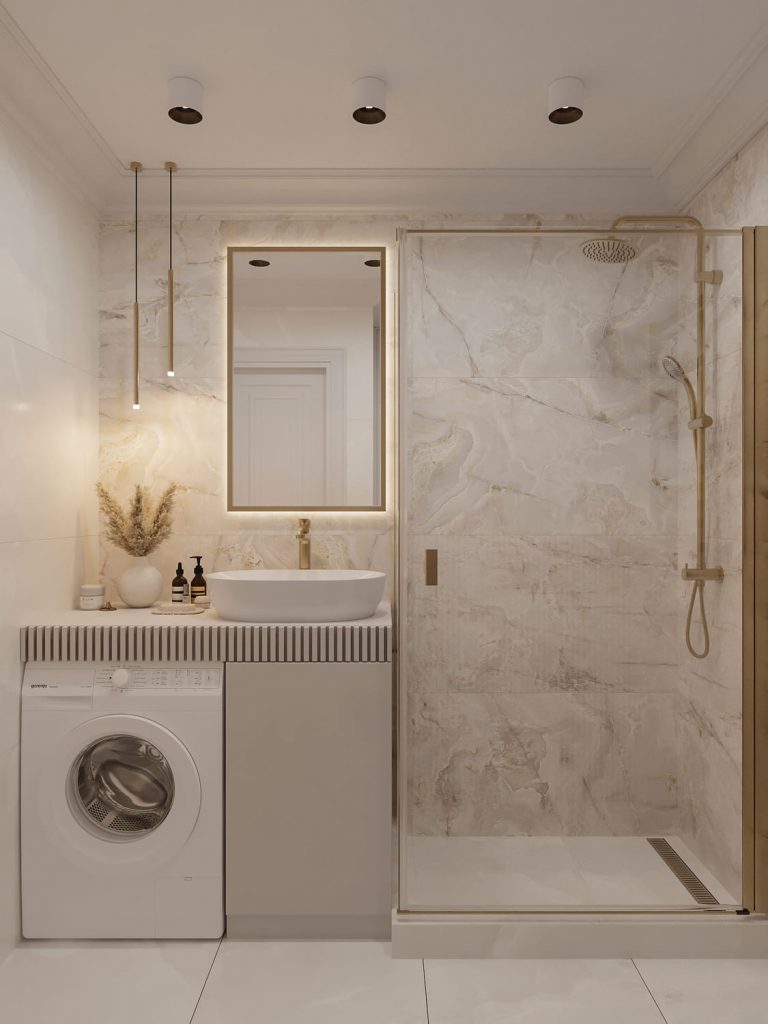 Под раковиной — тумба с рифлёным фасадом, визуально перекликающимся с декоративной панелью за унитазом. Интеграция стиральной машины в единую линию с тумбой и столешницей делает зону лаконичной и аккуратной. Над раковиной — зеркало с подсветкой и латунной рамкой, а дополнением к освещению служит подвесной светильник на тонких линиях — деликатный штрих в стиле современного ар-деко.