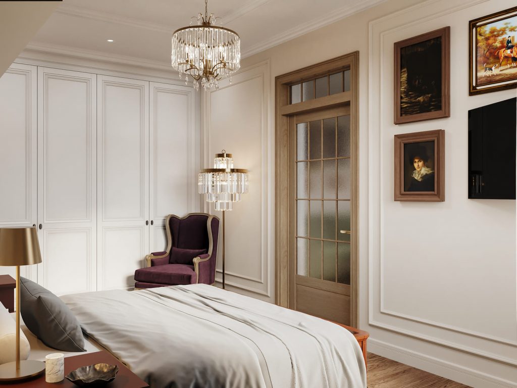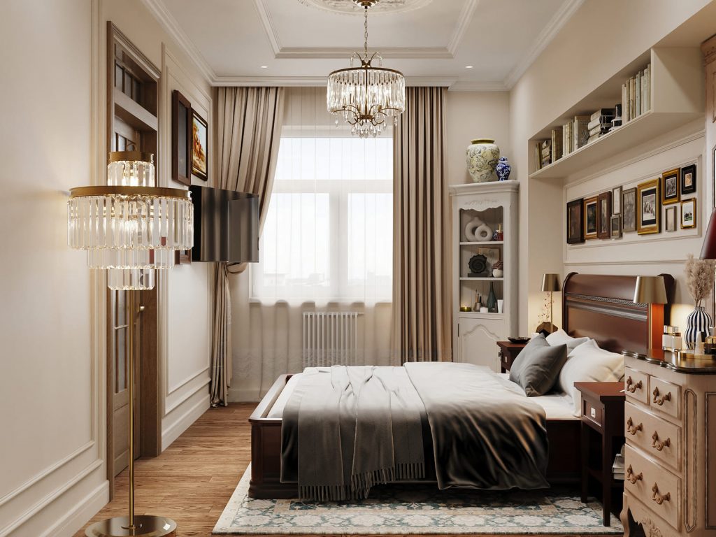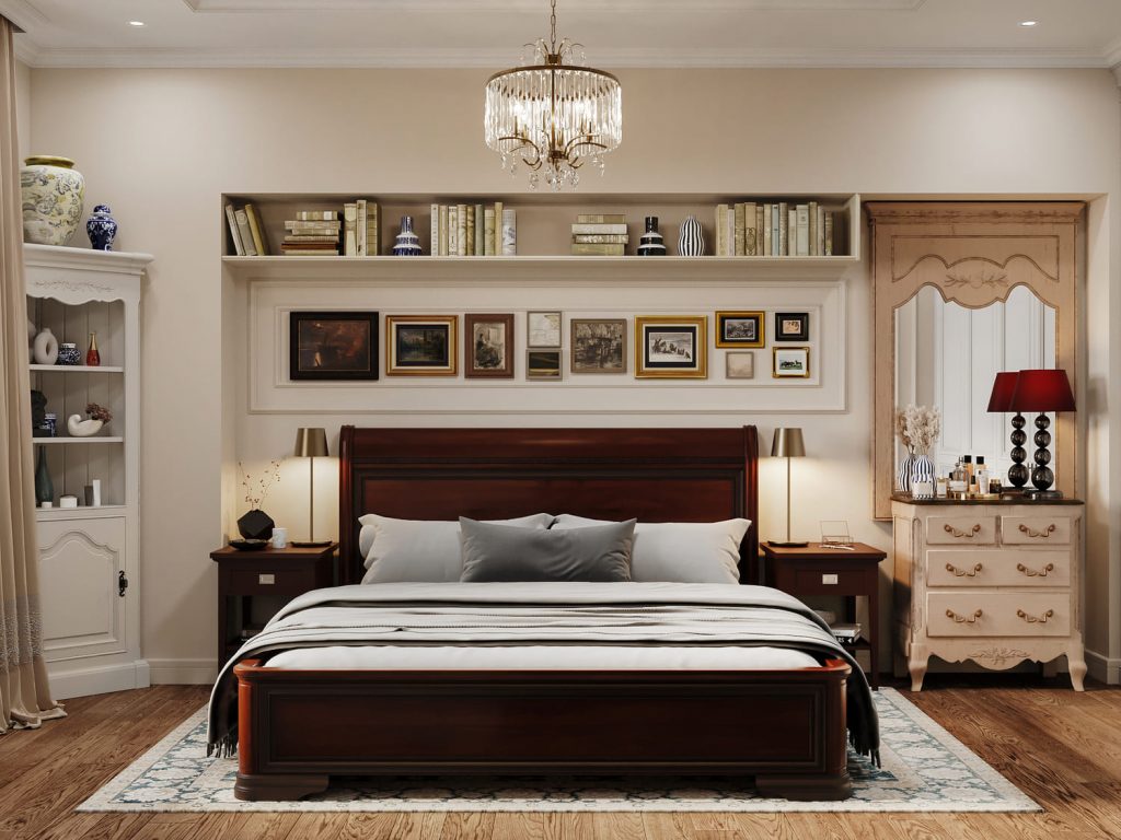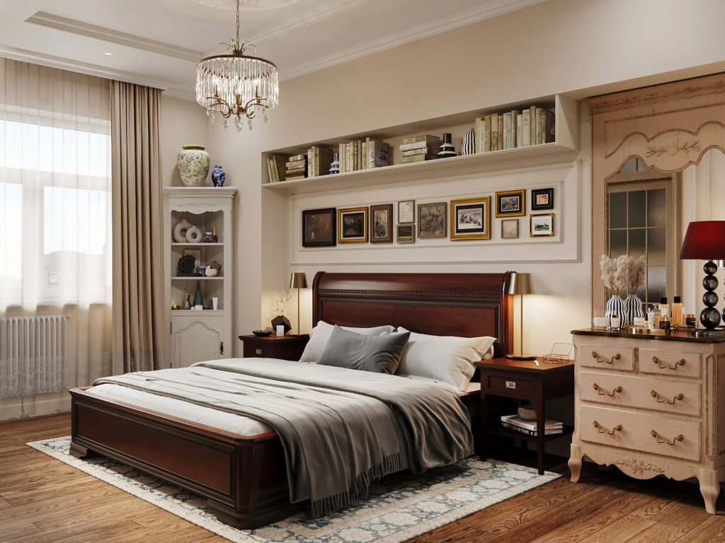 Интерьер спальни выдержан в изысканном классическом ключе с современными акцентами, что делает её одновременно элегантной и уютной. Центром композиции стало массивное деревянное ложе тёплого орехового оттенка. Над изголовьем — галерея картин и фотографий в разных по стилю и цвету рамах, а сверху встроена ниша с книгами и декоративными объектами. Такое решение объединяет функциональность и эстетику, превращая стену в полноценный арт-объект.