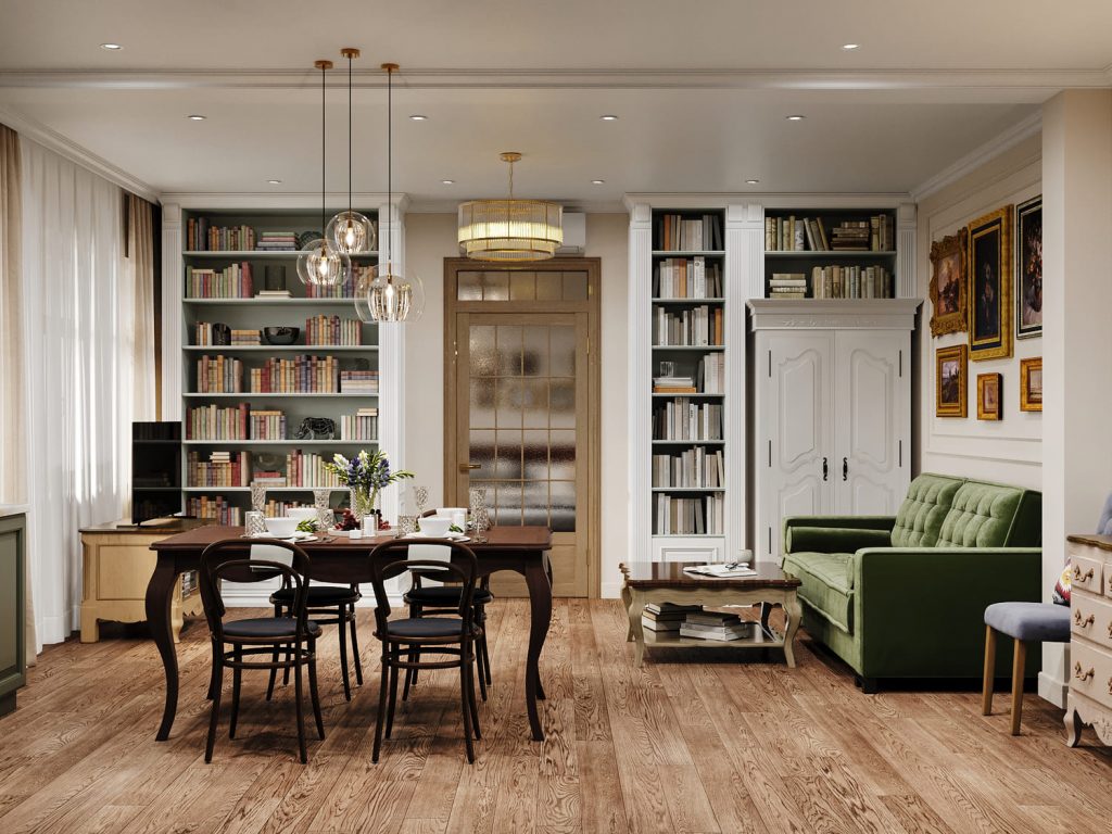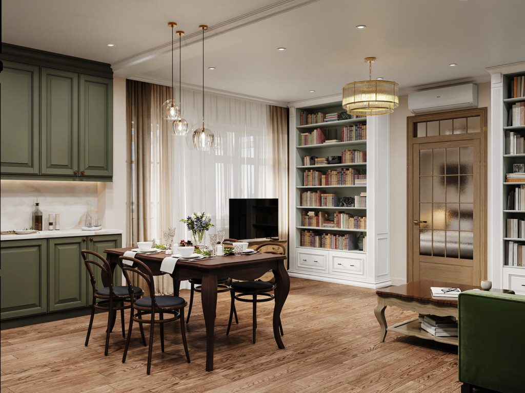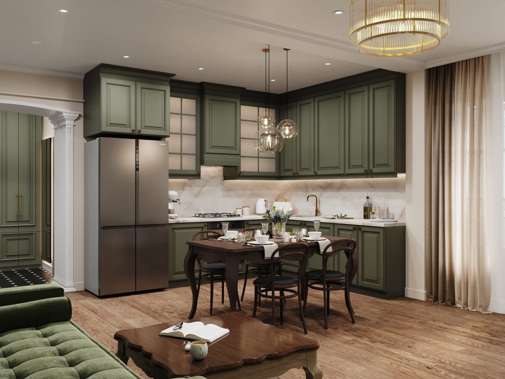 Кухонная зона оформлена фасадами глубокого оливкового оттенка с классическими филёнками, а мраморный фартук и столешница добавляют лёгкости и благородства. Встроенные светильники и подвесы над обеденной зоной формируют мягкий, многослойный свет.