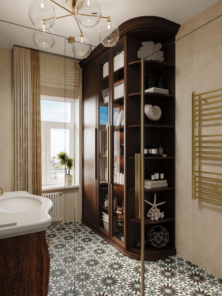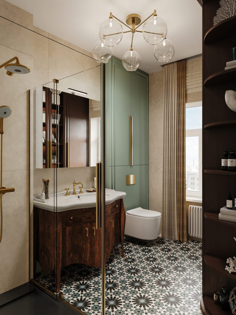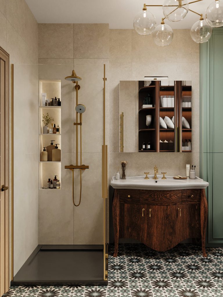 Эффектное напольное покрытие с орнаментальной плиткой создаёт атмосферу европейского ретро, при этом делая пространство динамичным и запоминающимся. Деревянная тумба с плавными изогнутыми линиями и мраморной столешницей отсылает к стилю ар-деко, а латунная фурнитура добавляет благородного блеска.