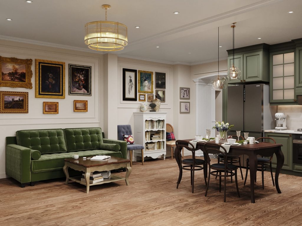Гостиная часть продолжает тему классики и пэчворка. Бархатный диван глубокого зелёного цвета выступает ярким акцентом, а на стене — коллекция картин в массивных золотых и чёрных рамах, каждая из которых хранит историю хозяев.