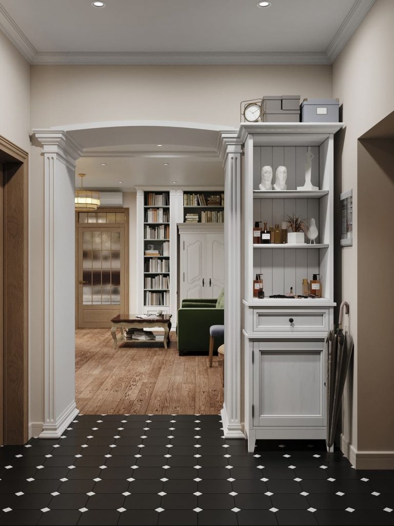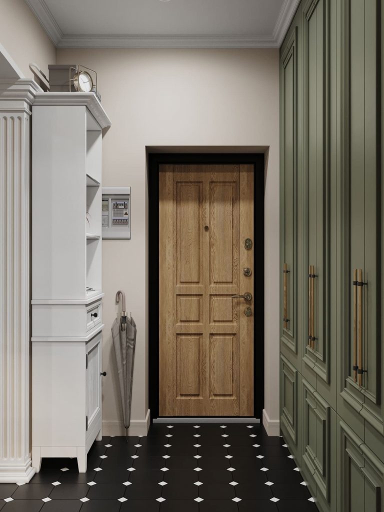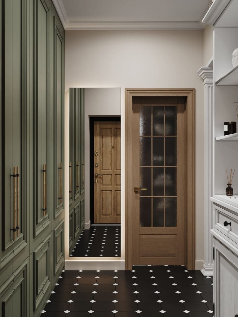 С первых шагов в квартиру гостей встречает продуманная и функциональная прихожая. Здесь удалось объединить практичность и декоративность: вместительные шкафы с классическими филёнчатыми фасадами окрашены в глубокий оливковый оттенок, который сразу задаёт настроение всему пространству.