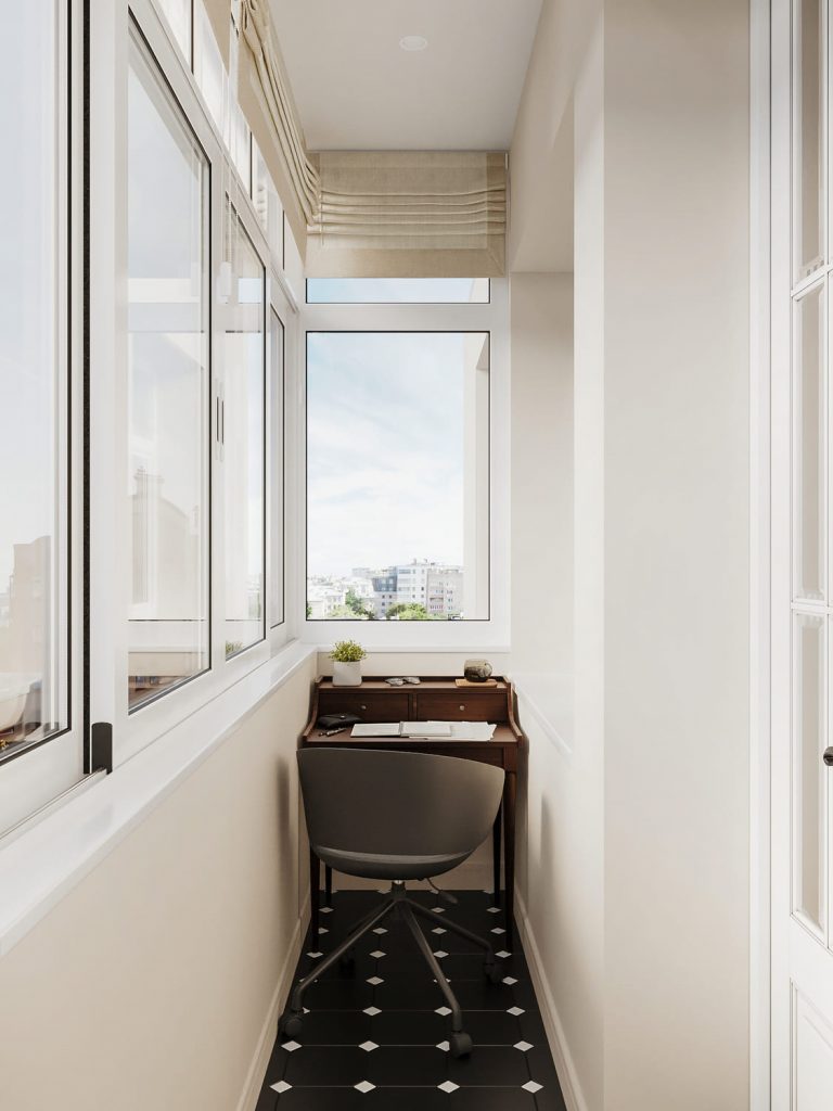 Узкое пространство оформлено минималистично и функционально: вдоль окна установлен компактный деревянный письменный стол с ящиками, дополненный удобным креслом на колёсиках. Белые стены и большое количество естественного света создают ощущение простора, несмотря на компактные размеры. Римские шторы мягкого бежевого оттенка добавляют уюта и позволяют регулировать освещённость.