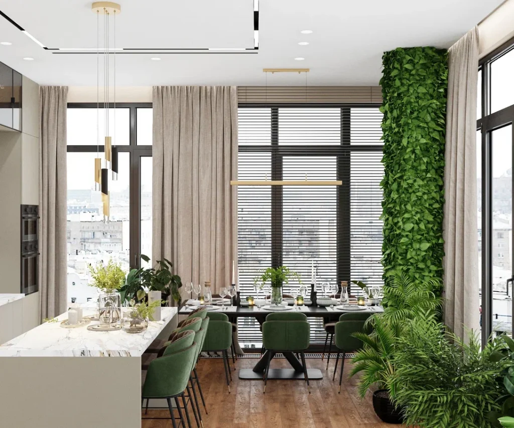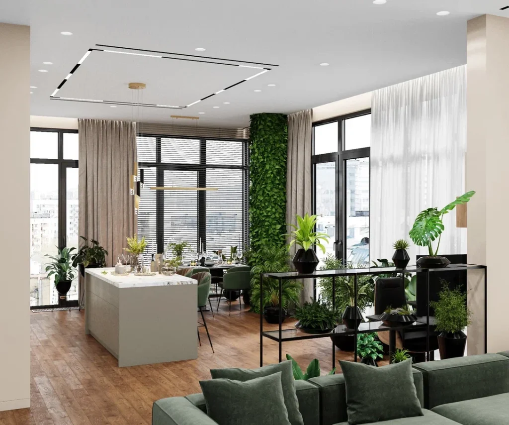 Помещение получилось просторным и насыщенным на зоны. В кухонной зоне разместилась вместительная прямая кухня с островом, рядом большая обеденная группа у панорамного остекления. Стоит отметить, что несущую колонну у окна было решено декорировать вертикальным озеленением. В целом, помещение имеет вид зимнего сада, так как хозяева квартиры очень любят комнатные растения. Гостиную и кухню отделяет рабочее место со стеллажом. Зона ТВ включает в себя огромный модульный диван, ТВ-горку и журнальные столики.
